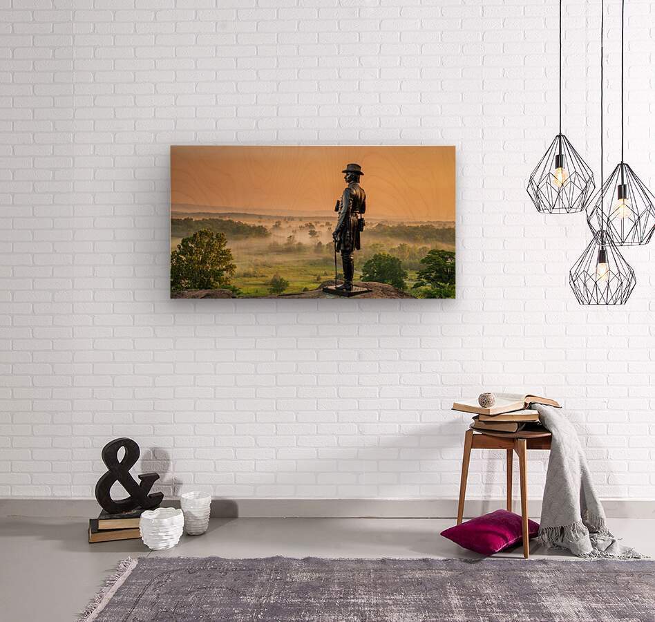 Dawns Embrace: A Vibrant Sunrise at General Warren Monument in Gettysburg  Wood print