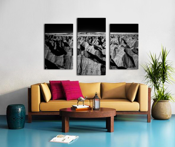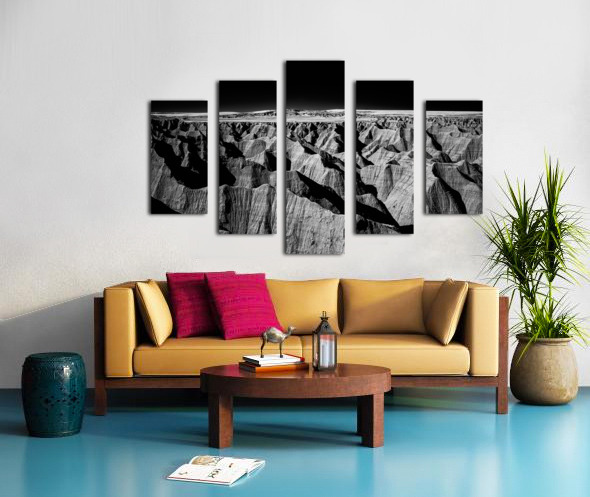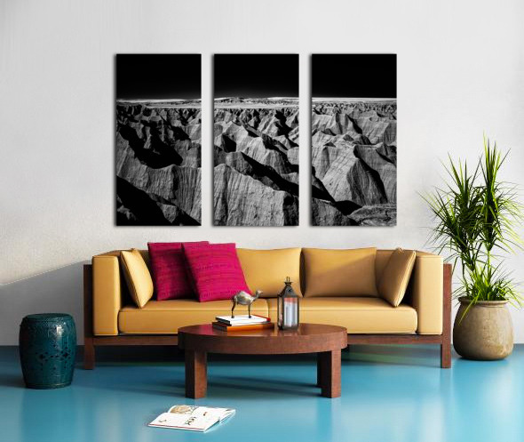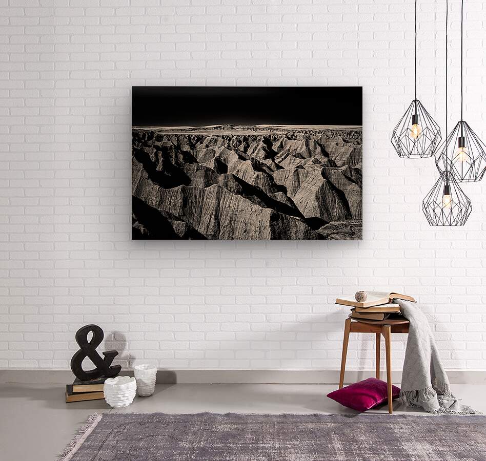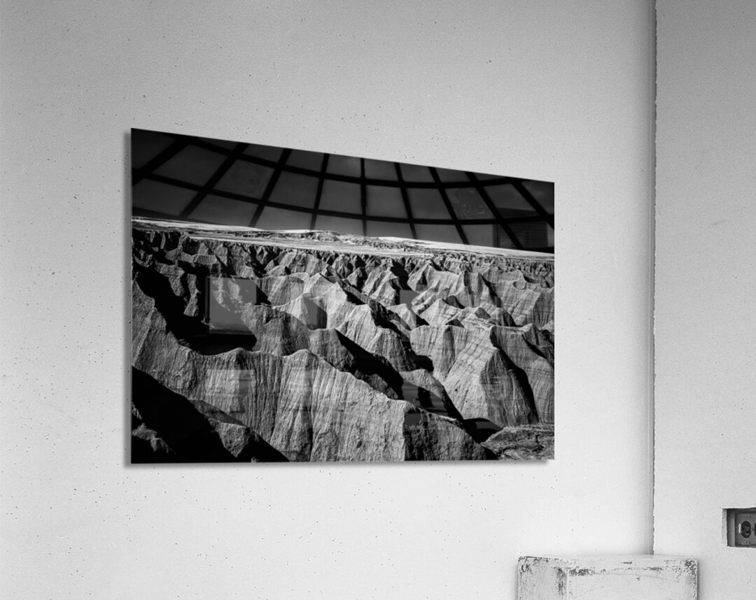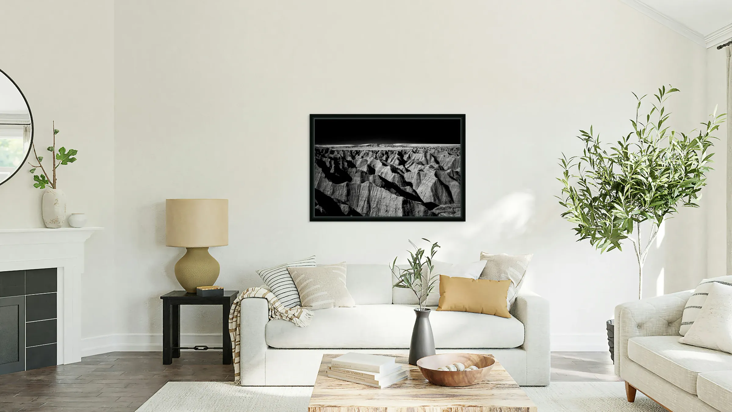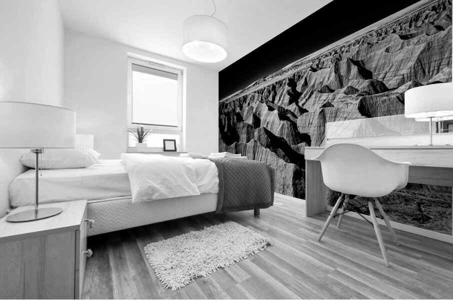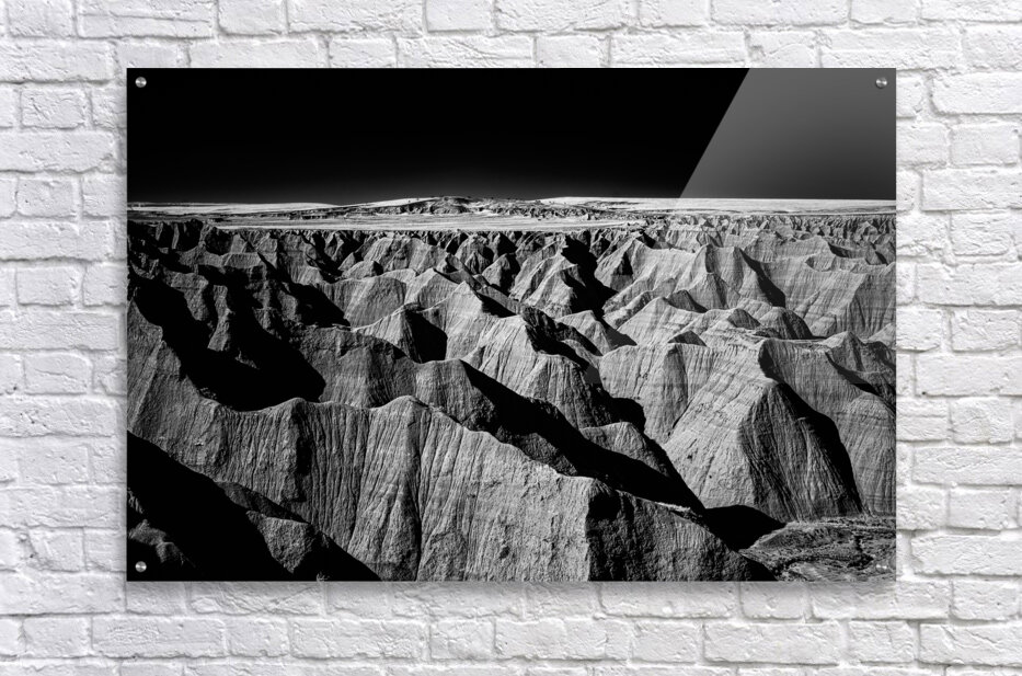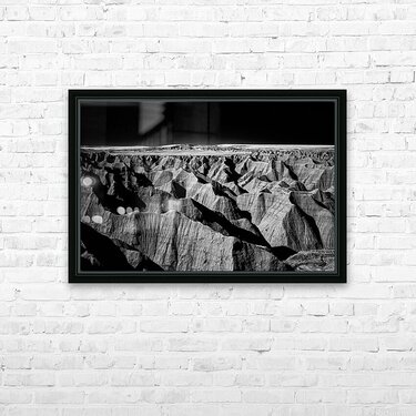 Embark on an unforgettable adventure as my wife and I journeyed through the captivating landscapes of the Badlands in South Dakota. Witness the breathtaking beauty of this rugged terrain where every shadow tells a story of mystery and intrigue. Step into a world where the shadows dance across the rugged earth revealing a landscape shrouded in enigma. The realm of sharply ridged hills and deep valleys is illuminated by a captivating play of light and shadow bringing texture and depth to every crevice. The horizon stretches endlessly beckoning the viewer to explore beyond the intricate patterns carved into the earth. In a black and white photograph that captures the essence of the lands ancient soul this artwork invites you to lose yourself in the Shadows of the Earth.