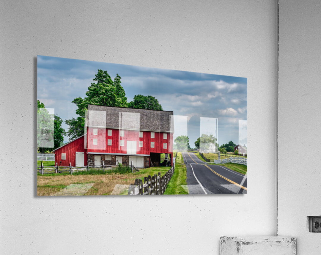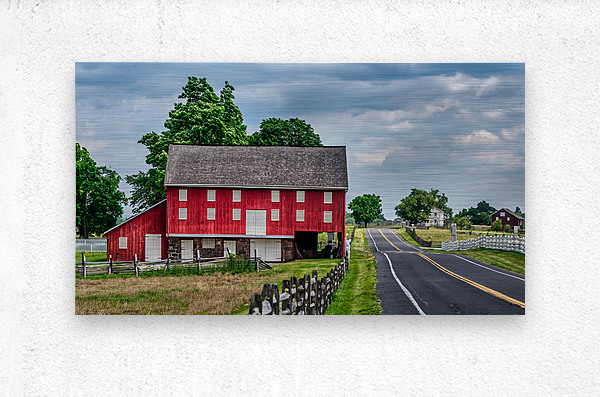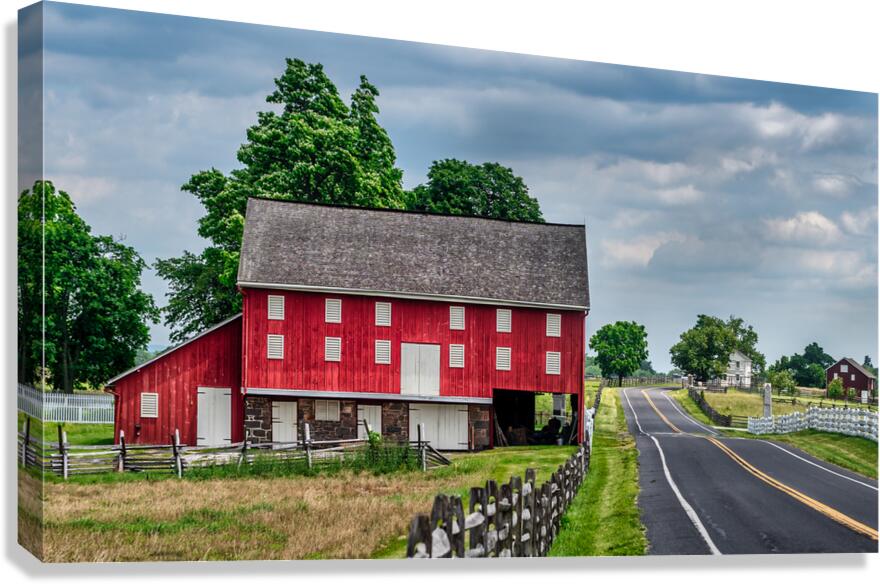 Capturing the essence of rural charm behold the iconic Sherfy red barn against a picturesque backdrop in Gettysburg Pennsylvania. This striking photog