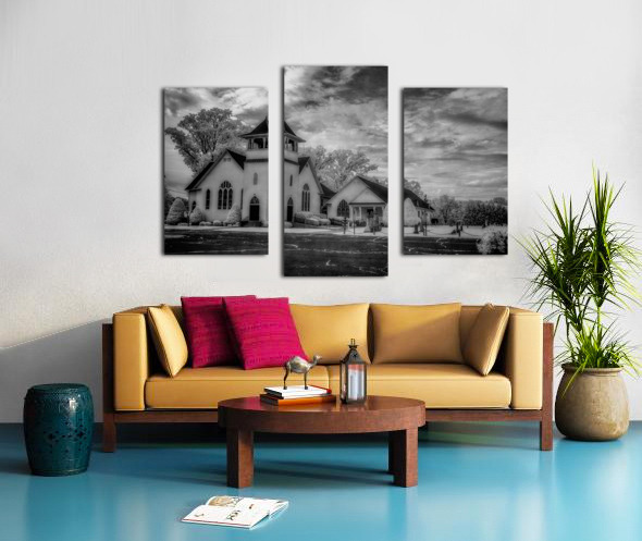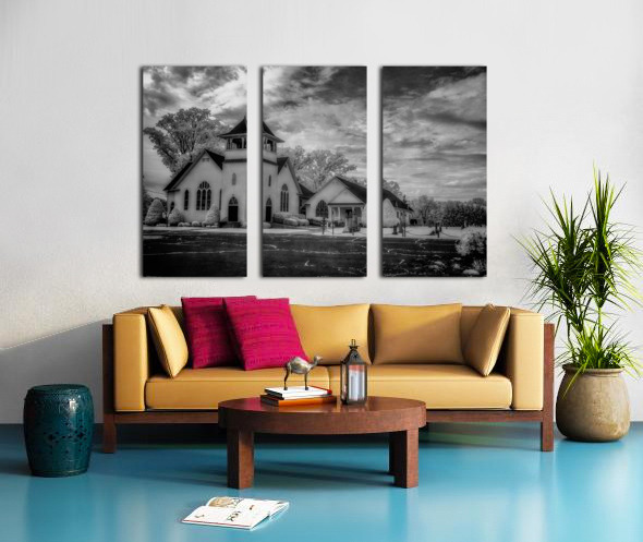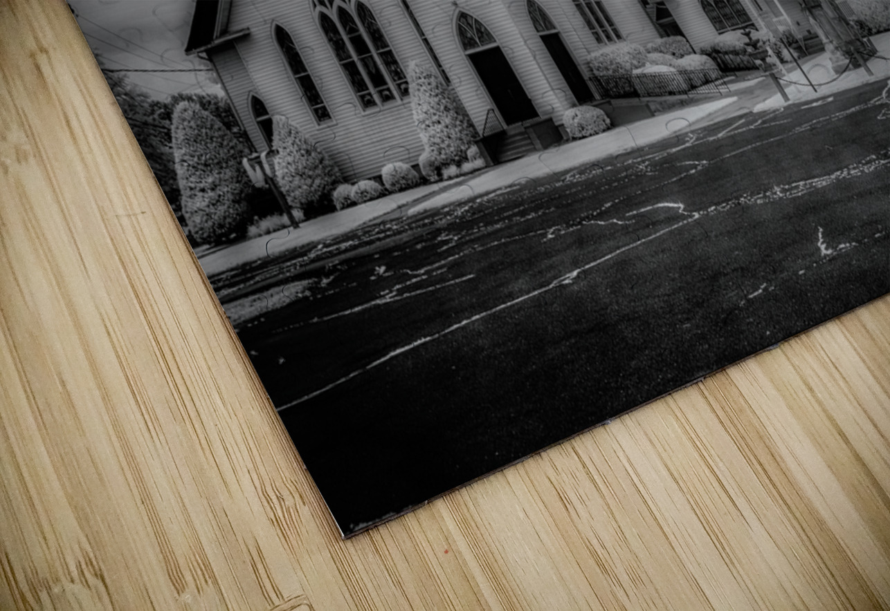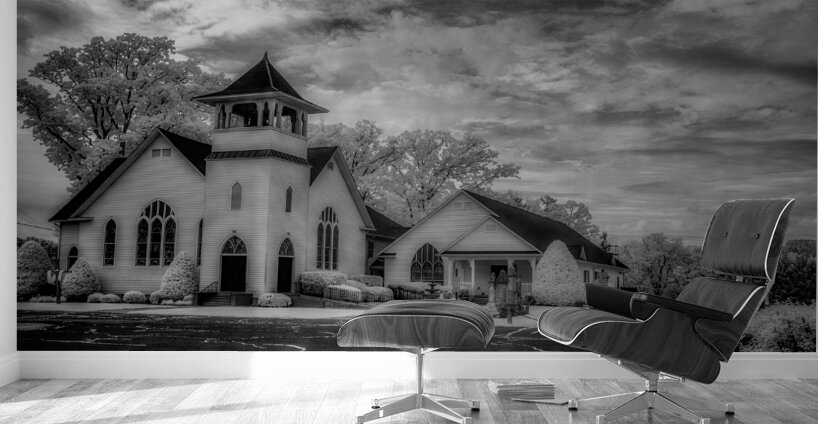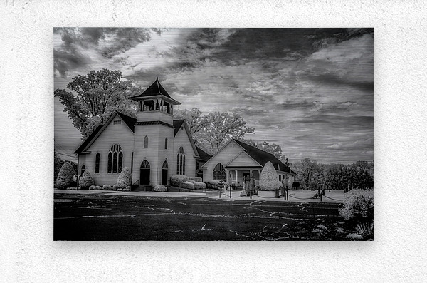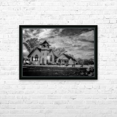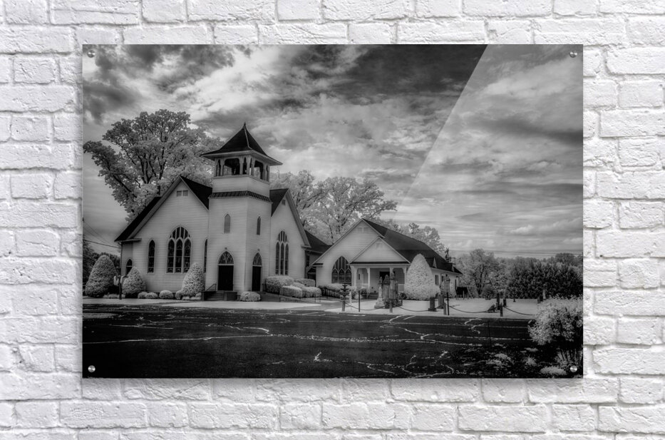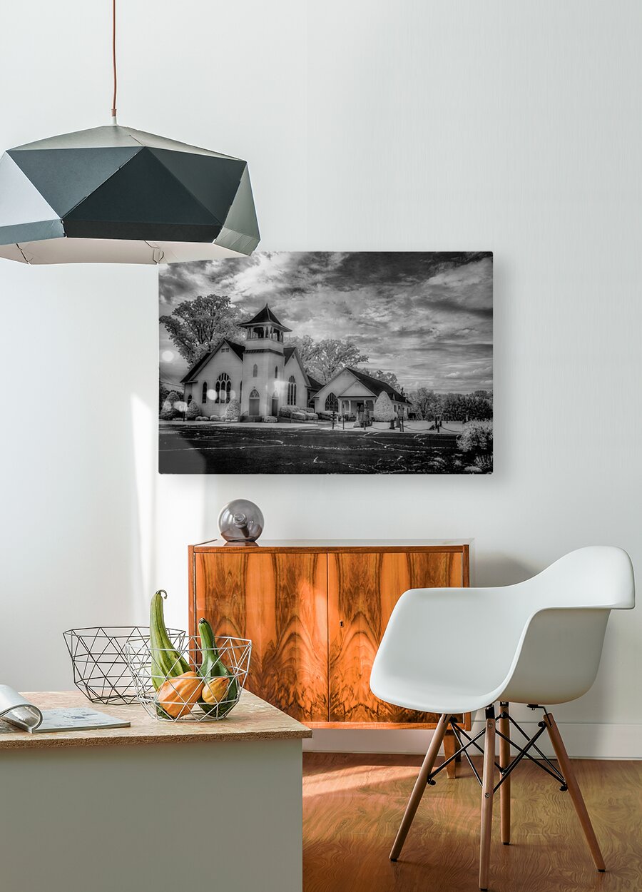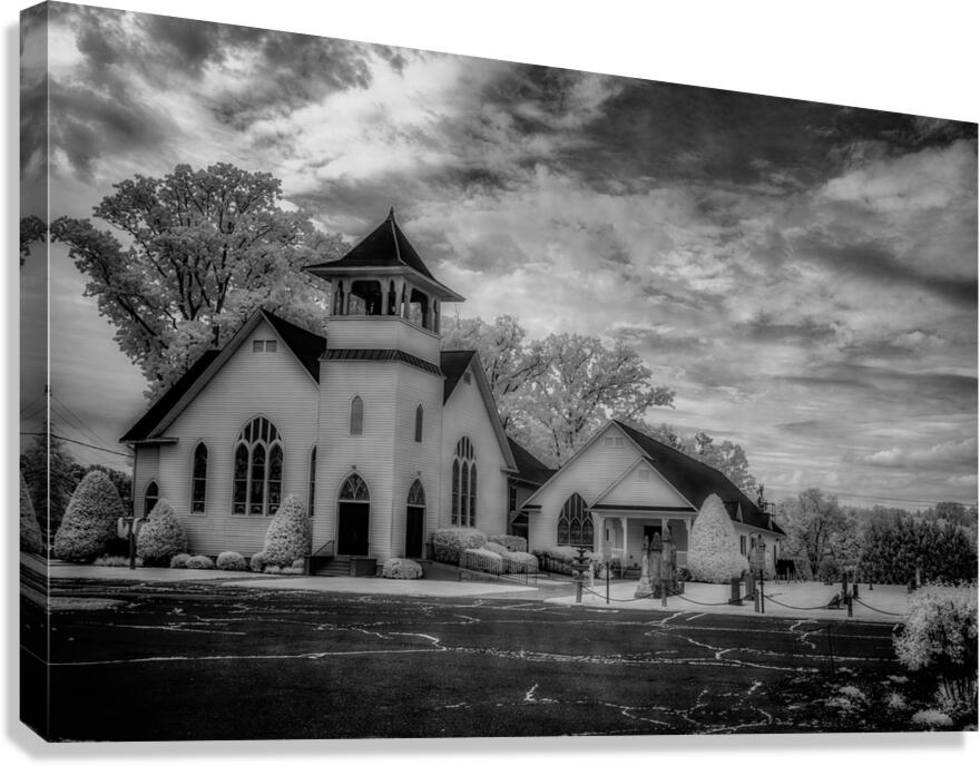 Step into the ethereal realm of Spiritual Splendor - Advance Majesty. A sacred homage to traditional Christian architecture this photograph transports you to a place of divine beauty and tranquility. With its soaring steeple and delicate pointed arch windows the majestic church exudes a sense of timeless grace. The meticulously landscaped surroundings with their perfectly trimmed bushes and towering trees create a serene atmosphere that beckons you to pause and reflect. The dramatic sky with its swirling clouds adds a touch of mystery and wonder to the scene. Every intricate detail of the architecture is highlighted in black and white giving the image a sense of grandeur and reverence. Allow yourself to be drawn into this awe-inspiring composition and experience the spiritual splendor of Advance Majesty.