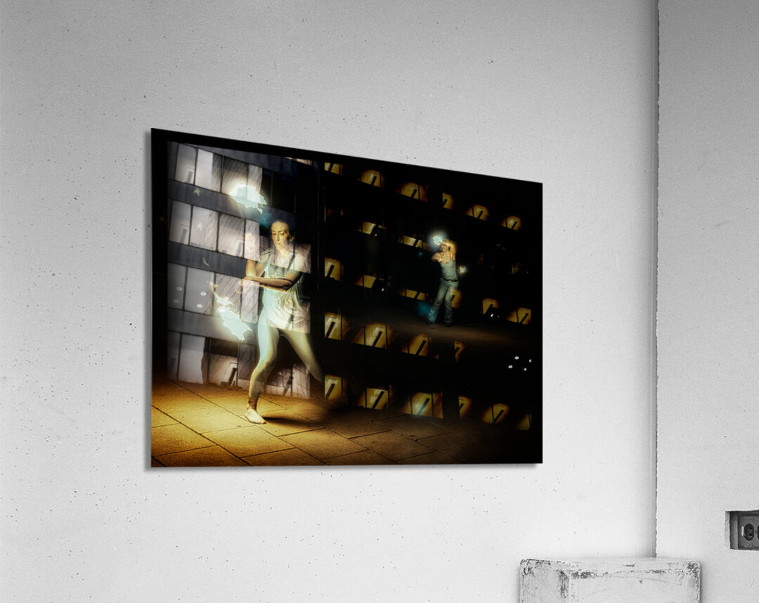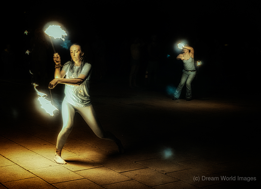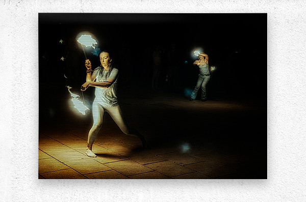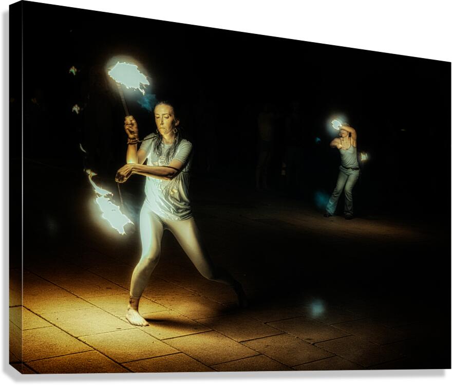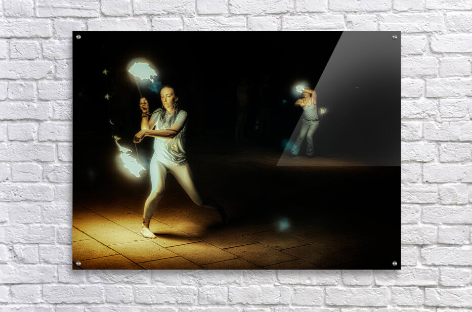 Fiery Grace in Motion is an evocative masterpiece that captures the ephemeral dance of flames and human spirit. This dynamic photograph plunges viewers into a nocturnal world where the boundaries between reality and enchantment blur. In the foreground, a woman clad in light-colored clothing navigates her fire prop with unparalleled grace. Her determined expression and fluid movements are dramatically illuminated by the fire, casting ethereal shadows that dance with her. She commands the space with an aura both fierce and serene, embodying the essence of fiery grace. In the background, another fire performer joins the choreographed chaos, their presence amplifying the intensity and coordinated beauty of the moment. The surrounding darkness serves as a blank canvas, elevating the luminance of the flames and creating a stark contrast that further accentuates the performers' silhouettes. The harmonious interplay of light and shadow, the poised movements, and the hint of danger, all converge to create an almost mystical ambiance. This photograph is not merely a visual feast but a spellbinding narrative of human skill, artistry, and the primal allure of fire.