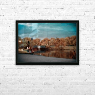 Immerse yourself in the mystical embrace of "Reflections of Golden Calm," a tranquil photograph that captures the serene essence of an autumnal park. This evocative scene, bathed in rich hues of orange and gold, unveils a world where time seems to stand still. Majestic trees, clad in their autumnal finery, stand sentinel by a peaceful body of water. Upon this glassy surface, the vibrant foliage and an elegant stone bridge mirror each other, weaving a tapestry of duality and reflection. A winding path, flanked by vintage lamp posts, beckons the observer to journey through this idyllic landscape, leading towards the enigmatic bridge that unites both sides of the water. The sky above is a dramatic tableau, where a dance of blue and gray clouds adds a touch of melancholy to the serene vista below. The overall imagery evokes a calm and reflective mood, inviting the viewer to pause and absorb the profound natural beauty encapsulated within the frame. This piece captures not just a moment, but an experience—a deep, contemplative breath of nature's grandeur, forever preserved in a sublime balance of color and light.