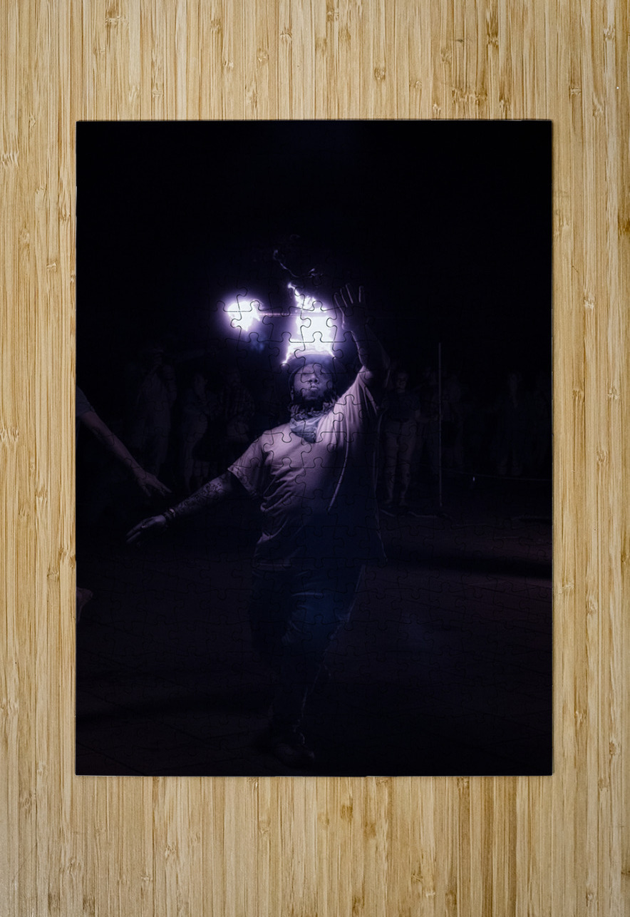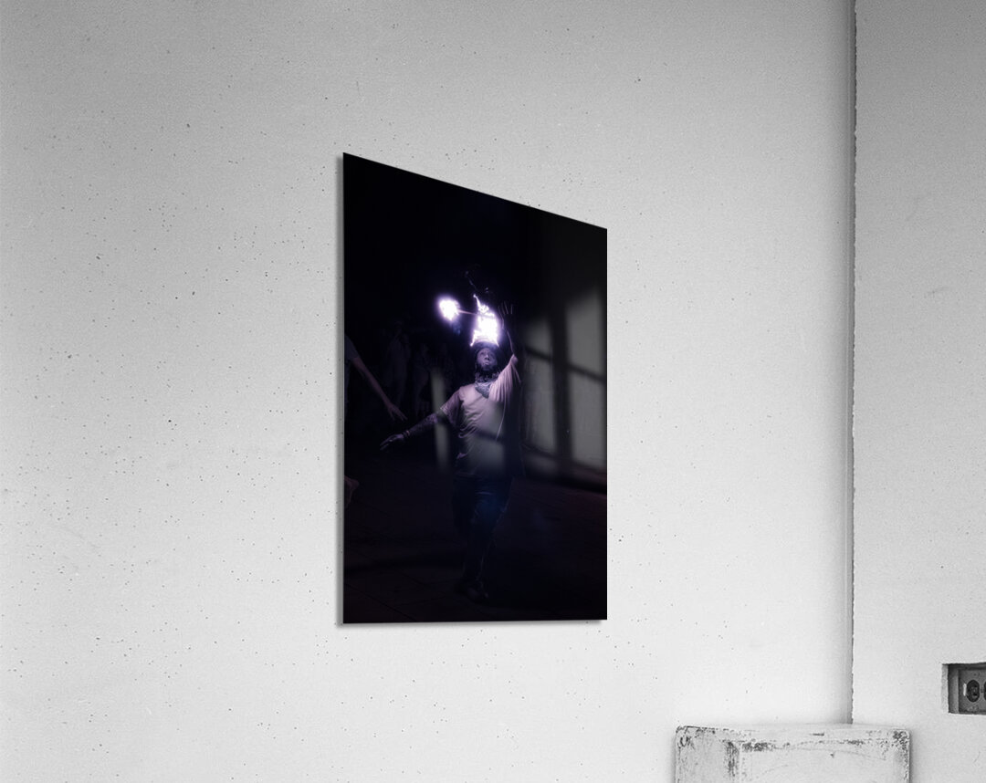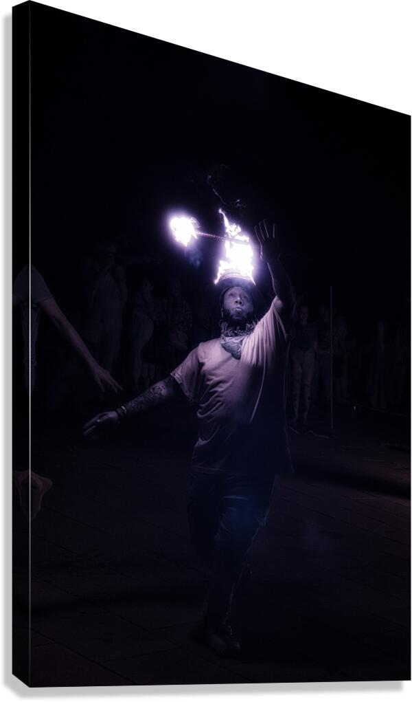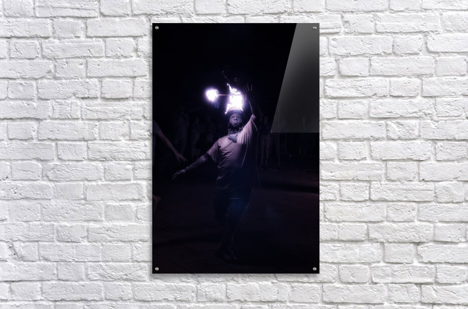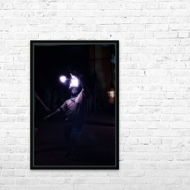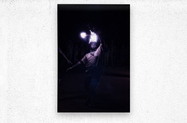 Flame Alchemist in Shadow is an entrancing nocturnal scene where a master of fire commands both light and darkness. The performer poised in the very heart of the image wields a fire staff with a dancer’s grace and an alchemist’s precision. Trails of flame scorch the night air creating arcs of light that seem to pierce through the darkness offering a glimpse into an ancient almost mystical ritual. The image is shrouded in the deep velvety embrace of midnight transforming the background into an abyss that amplifies the fiery spectacle. It is within this void that the flames breathe life into the photograph casting an intricate tapestry of shadows that dance upon the canvas. The interplay of light and shadow weaves a narrative of intensity and focus as if the performer is conjuring the elemental spirits through sheer will and movements. This piece captures the ephemeral nature of performance and flame a fleeting moment suspended in time that mesmerizes with its vibrant motion and stark contrast. The dynamic energy of the fire juxtaposed against the stillness of the night evokes a sense of otherworldly magic drawing the viewer into an intimate communion with the fiery display. The photograph becomes a portal inviting all who gaze upon it to step into the shadows and witness the alchemy of flame and form.