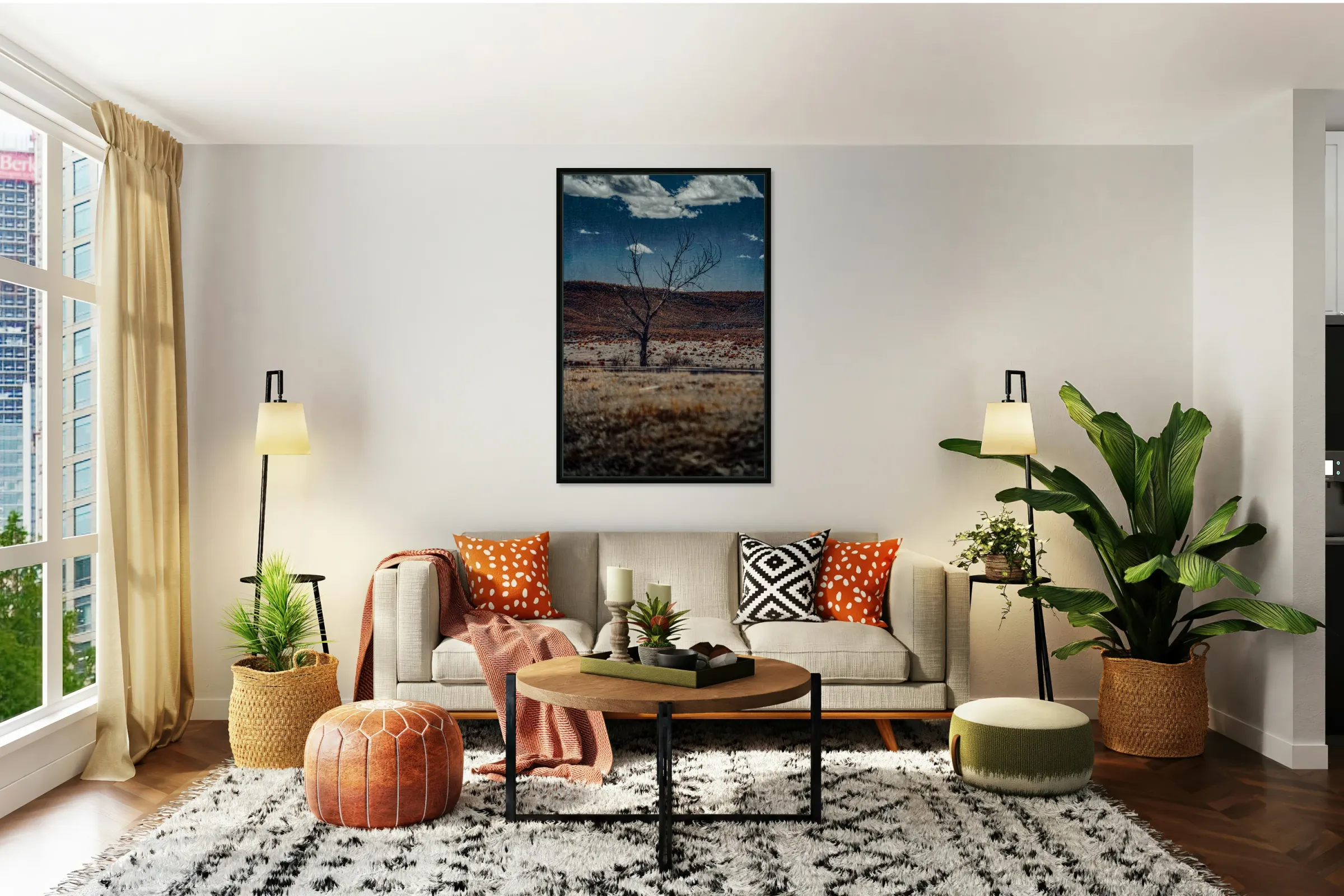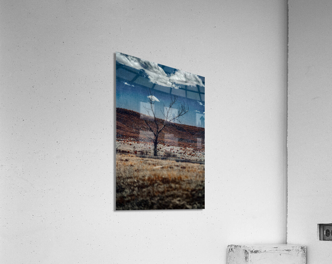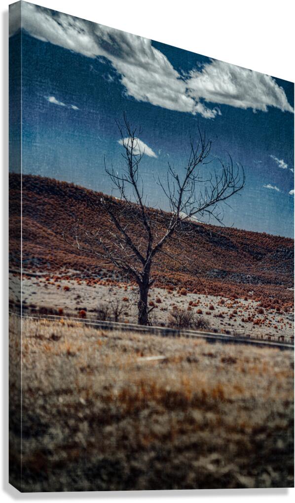 Stoic Silhouette in a Desolate Expanse is an evocative photograph that transcends the ordinary capturing a solitary leafless tree standing in a desolate landscape. The tree a spectral guardian asserts its presence against a backdrop of undulating hills cloaked in muted earth tones. This palette whispers tales of an arid or semi-arid realm where life battles in serene quietude. The heavens above swirl a deep rich blue interrupted only by scattered clouds—ethereal sentinels punctuating the sky adding depth and a contrasting ballet of light and shadow. The foreground slightly blurred serves to elevate the solitary tree rendering it the unequivocal focal point of the scene. This masterful play of focus and composition envelops the viewer in a melancholic embrace invoking profound themes of solitude and resilience. The overall scene is striking an enigmatic echo of times passage and natures enduring spirit. The art invites you to ponder its silent narrative—an introspective journey through isolation fortitude and the austere beauty of a desolate expanse.