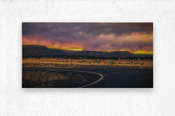 In this captivating photograph lies an enigmatic landscape frozen in the ephemeral breath of sunset. The expansive open terrain beckons as a winding road meanders through the foreground drawing the viewer into its mysterious journey. On the horizon ancient rugged mountains stand sentinel their flat tops silhouetted sharply against a sky alive with drama and intensity. Above dark ponderous clouds swirl and coil shrouding the scene in a veil of intrigue. Yet as if by the hand of an unseen alchemist these brooding clouds give way to a spectacular display. The setting sun ignites the heavens saturating the horizon with a warm golden light that spills mercilessly across the terrain. This celestial glow contrasts vividly with the shadowy foreground creating a sublime tension between light and dark that hints at hidden stories and untold adventures. This photograph is more than a mere landscape it is a narrative of transformation and transcendence inviting the observer to lose themselves in its mystical embrace.