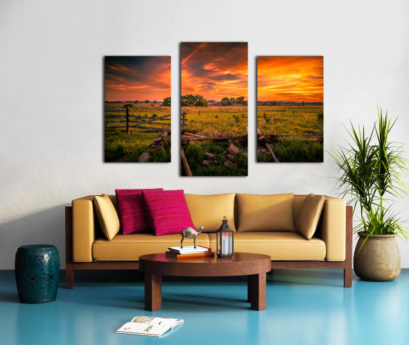 The image captures a serene rural landscape during what appears to be either sunrise or sunset. The sky is dramatic filled with warm tones that range from deep orange to a soft yellow with whisps and streaks of clouds creating texture. This vibrant sky casts a golden hue over the scene. Below this fiery sky the land is tranquil consisting of an expansive field dotted with patches of tall grasses and wildflowers. Towards the center of the image a modest structure possibly a farmstead or house adds a human element to the otherwise natural vista. Its presence is minimized by the vastness of the sky and the open field. In the foreground a rustic wooden fence in a state of disrepair draws the viewers attention. The fence line leads towards the center providing depth and guiding the eye through the grassy field towards the horizon and the farmstead in the distance. The lighting in the image is soft and warm indicating the low angle of the sun. The overall effect is one of peacefulness and the simple beauty of rural life amplified by the grandeur of the colorful sky above.