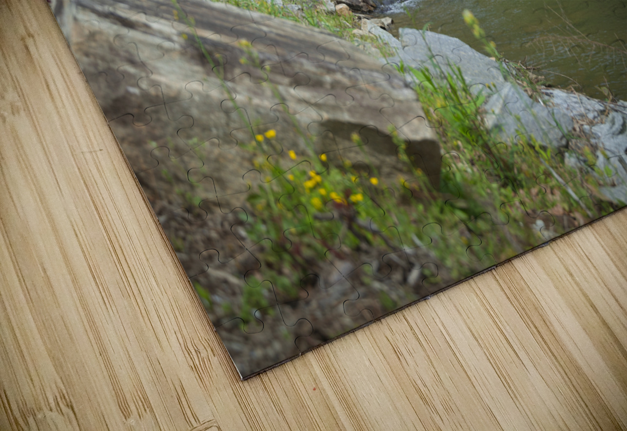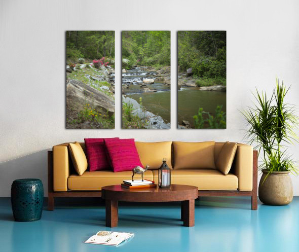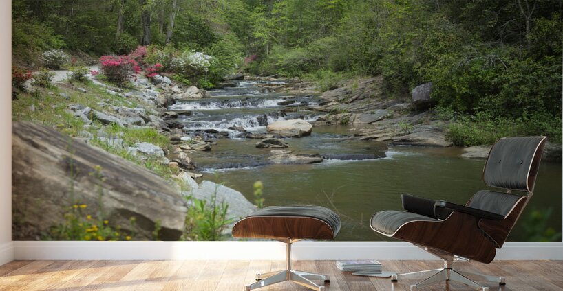 Step into a world of flowing tranquility where a cascading stream winds its way through a rocky landscape creating a serene and mesmerizing scene. The water dances and weaves its way over rocks forming small waterfalls along the path. Lush green foliage surrounds the stream providing a vibrant backdrop to the waters journey. Splashes of color from blooming azaleas add a touch of contrast and beauty to the landscape. Large rocks and boulders are scattered throughout some submerged in the water others resting on the banks. A weathered log and smaller stones in the foreground add a sense of rustic charm to the scene. Immerse yourself in the natural and untamed beauty of this mystical artwork where every detail tells a story of tranquility and wonder.