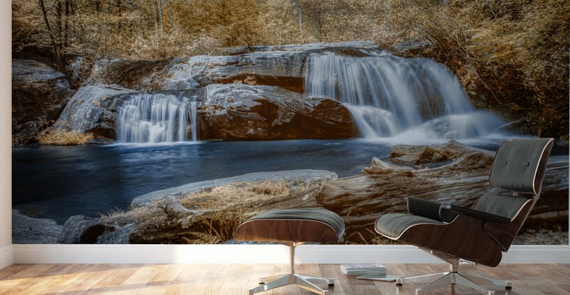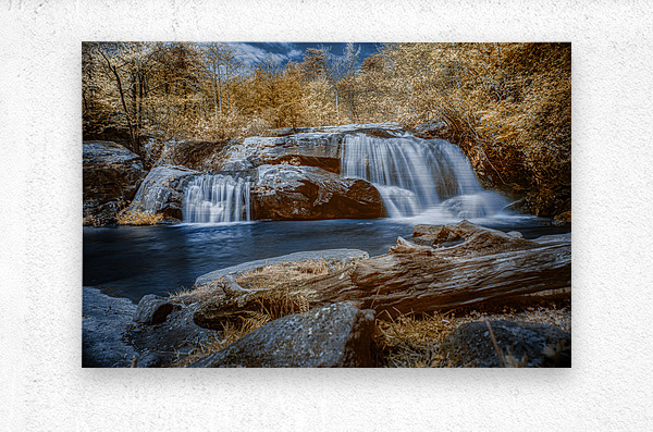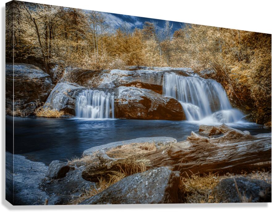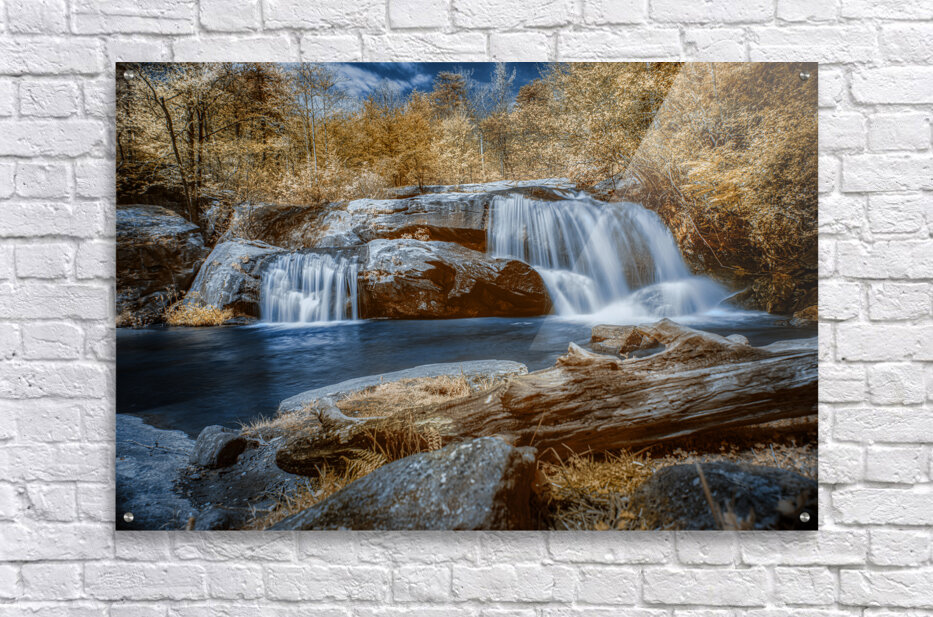 Step into a world of enchantment with Sapphire Serenity. This breathtaking photograph transports the viewer to a realm of tranquility and magic where a majestic waterfall flows gracefully over rugged rocks into a serene pool of water. The ethereal quality of the monochrome foliage bathed in hues of bronze and white creates an otherworldly atmosphere against a vivid blue sky. The sapphire tones of the water enhance the dreamlike quality of the scene while the textures of the rocks and fallen log add a sense of grounding and detail. Lose yourself in the beauty of this mystical and enigmatic landscape where natures wonders unfold with every gaze.