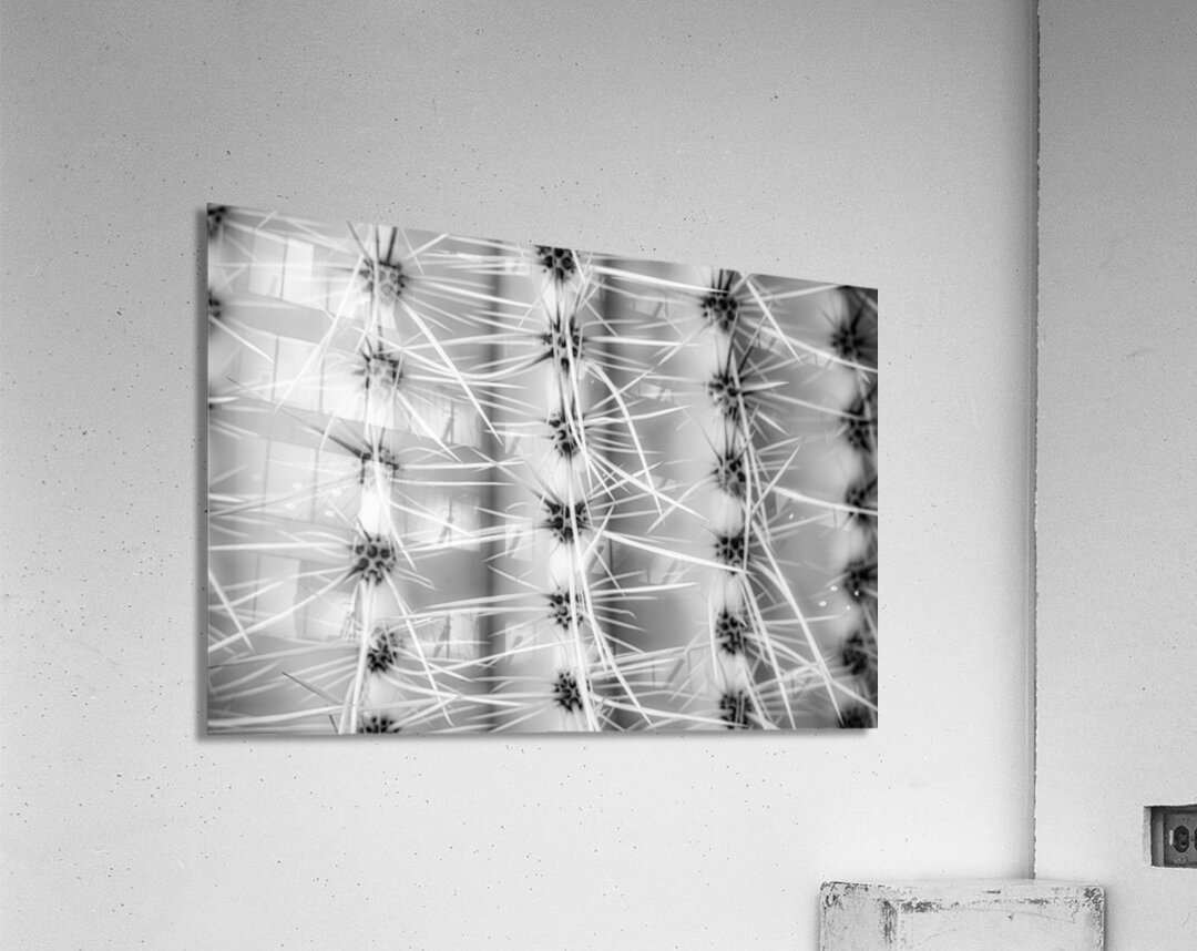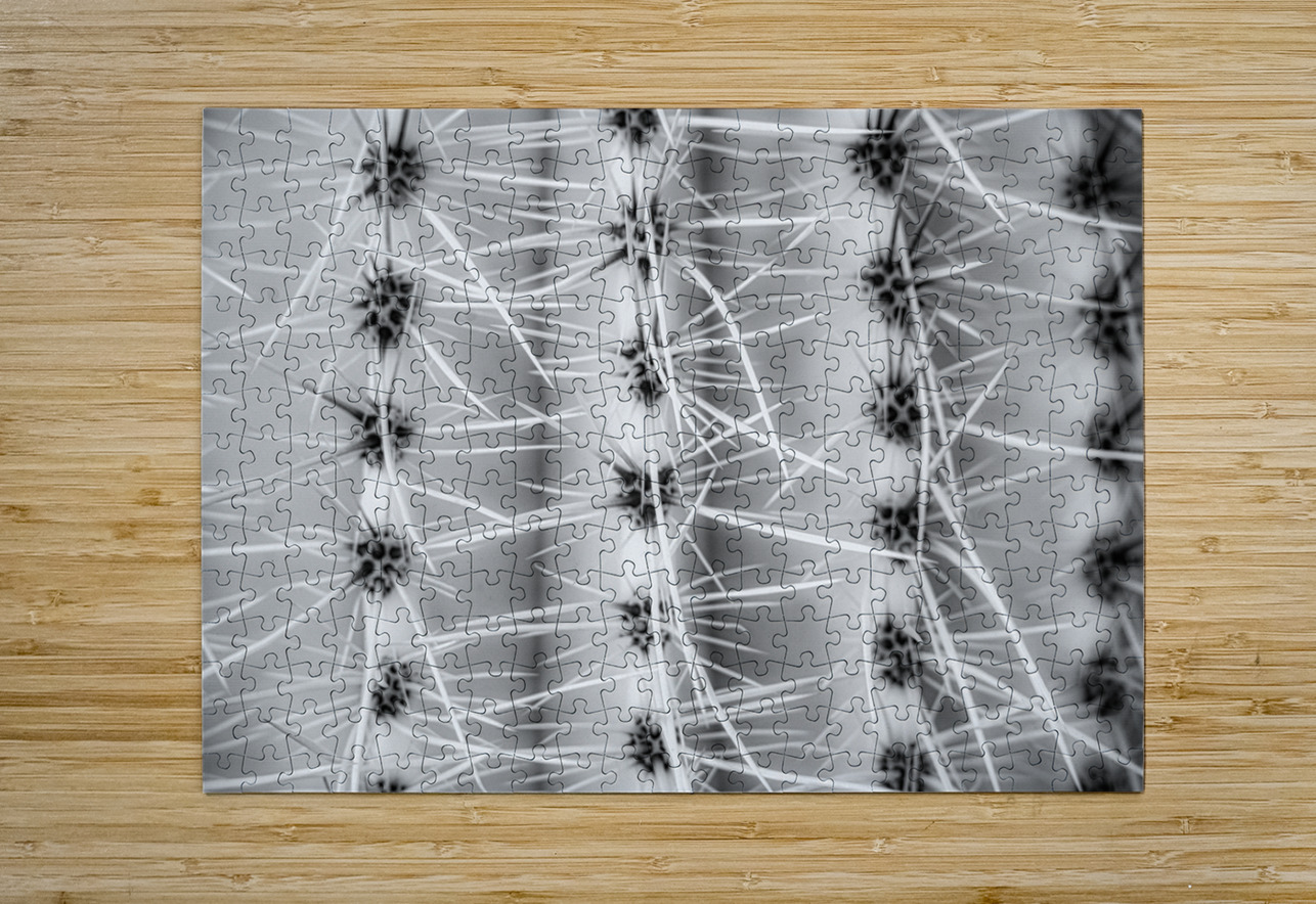 "Symmetry in Spine" invites viewers into a realm where the ordinary transcends its bounds to reveal an otherworldly spectacle of form and contrast. In this captivating black and white photograph, a cactus unfurls its hidden architectural wonders, transforming into a celestial landscape of geometric precision and abstract beauty. Each spine emerges with a crystalline sharpness, radiating with a purposeful grace from the core, drawing the gaze into a dance of primal patterns and mesmerizing symmetries. This botanical labyrinth, both calculated and chaotic, weaves a narrative of nature's inherent duality—the harmony and the tension, the fierce and the fragile. The monochromatic hues serve as a bridge between worlds, allowing shadows to play with light in a ballet of chiaroscuro. Here, the stark interplay reveals not only the tactile textures of the cactus's surface but also the enigmatic whispers hidden within its serrated embrace. The viewer is invited to ponder the infinite repetition, to lose oneself in the rhythmic echoes of sharp lines and shadowed spaces, and to find solace in the symmetrical sanctity of nature’s own design. In this visual journey, the observer is drawn into a realm of geometric wonder, where ridged columns rise like ancient sentinels, guarding secrets of desert solitude. The black and white rendering strips away distraction, distilling the essence of this natural marvel into an immersive exploration of its rhythmic patterns. Delve into the profound simplicity of nature’s architecture, as the sinuous forms whisper of an untamed beauty that transcends the boundaries of the known world. Prickly Pathway beckons with its mystic allure, inviting contemplation and introspection and offering a glimpse into the untold elegance hidden within the familiar.