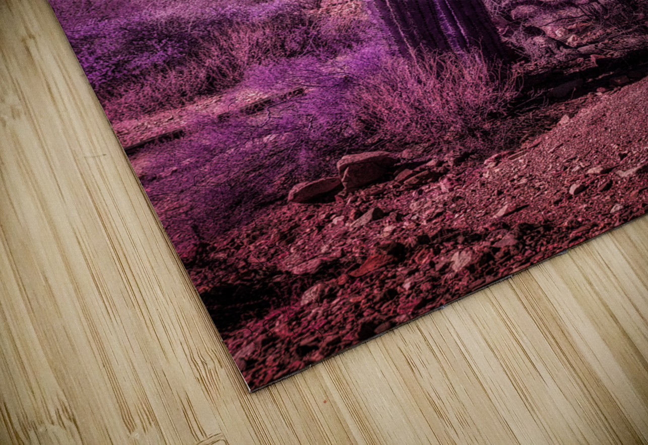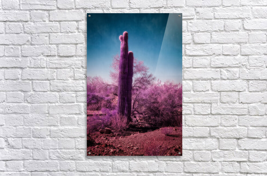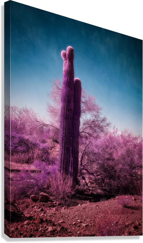 In the heart of the Sonoran Desert, where reality bends through infrared's revealing eye, I discovered a realm where saguaros wear royal robes and the familiar transforms into fantasy. Through my lens, this ancient sentinel, standing proud against an ethereal blue sky, became something more than just a desert guardian - it became a gateway to another dimension. The surrounding vegetation, typically subtle in its desert garb, explodes into a symphony of purple and magenta, as if nature decided to throw a cosmic celebration. The infrared technique reveals what our eyes can't see - the living energy of the desert, dressed in colors usually reserved for twilight dreams and dawn's first blush. Some say the desert holds secrets beneath its sun-baked surface. On this day, as my infrared camera pulled back the veil between worlds, those secrets painted themselves across the landscape in shades of purple normally hidden from human sight. This isn't just a cactus in the desert - it's a testament to the magic that exists just beyond our normal vision, waiting to be revealed.