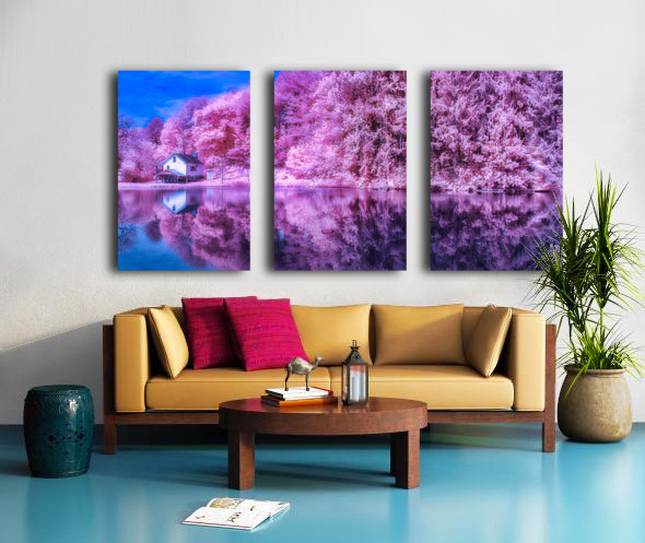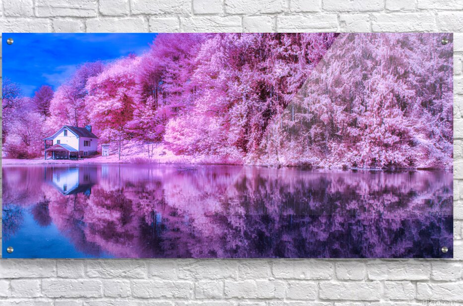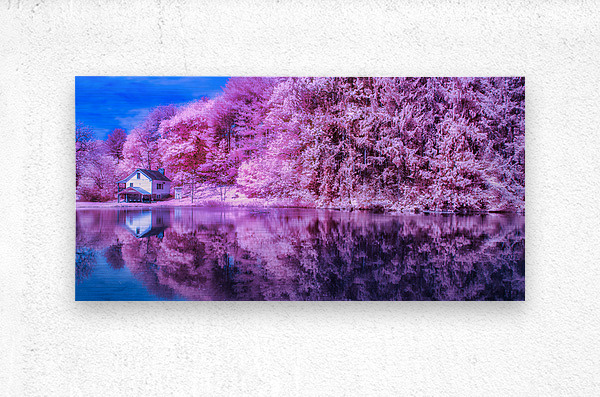 Natures perfect reflection captured through infrared photography where reality melts into dreams. Pink foliage dances with deep blue skies doubled in still waters below.