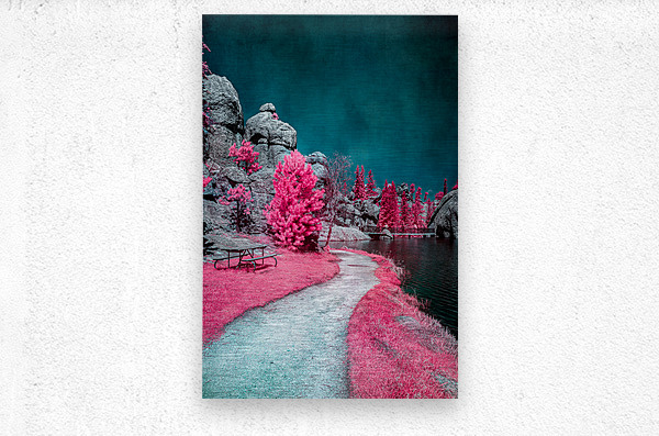 Basking in the warm embrace of a beautiful South Dakota day our journey led us to the picturesque Sylvan Lake in Custer State Park a serene haven cradled by natures allure. As we immersed ourselves in this tranquil setting the enchanting landscape unfolded offering endless opportunities to capture the timeless beauty gracing Sylvan Lake. Pink Serene Trails a mesmerizing glimpse into this idyllic escape captures a moment along the lakeside path where the alchemy of infrared treatment weaves a dreamy ambiance. The sky transformed into a soothing blue-green hue creates a celestial backdrop that harmonizes with the delicate shades of pink adorning the trees. Natures palette unfolds in a symphony of colors inviting you to lose yourself in the ethereal beauty of Sylvan Lake. As you wander the trail natures handiwork reveals itself through weathered boulders and a rustic picnic table positioned strategically to invite moments of quiet contemplation. The path winding behind a majestic dead tree adds an intriguing touch to this enchanting scene guiding your exploration through the heart of Sylvan Lakes natural wonders. Pink Serene Trails is a testament to the captivating beauty around every corner of Sylvan Lake. This South Dakota gem unveils its secrets with each step. The photograph invites you to join the journey where weathered elements and vibrant hues converge to create a tranquil reverie in the heart of nature. As you explore the serenity of Sylvan Lake may Serene Trails become a cherished window into the enchantment that defines this South Dakota haven.