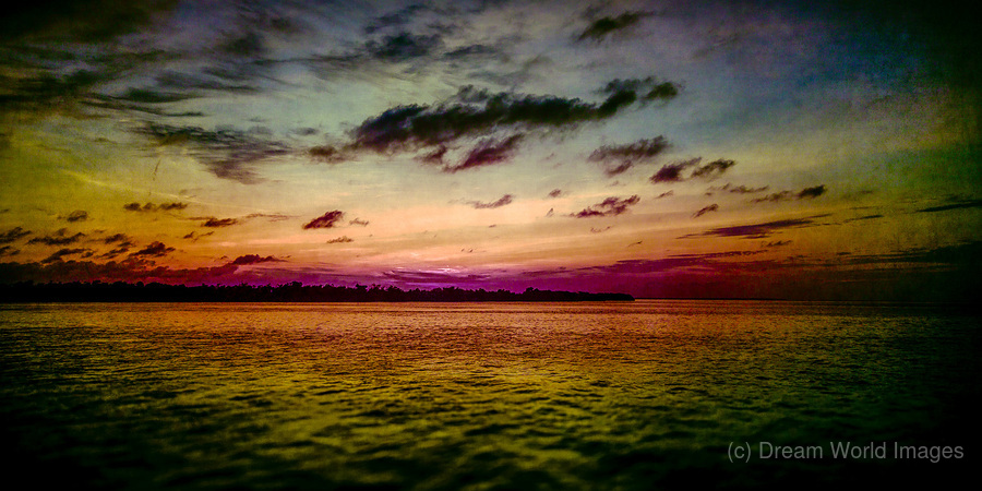Where day surrenders to twilights embrace in the Florida Keys sky and sea share secrets in purple and gold. Through full-spectrums revealing eye even clouds become artists painting dreams on waters canvas. Some moments dont just end days - they birth magic