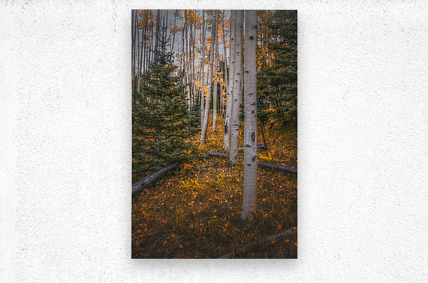 Eternal Transition of the Forest" tells a timeless tale where nature's most magnificent performers take center stage. In this mystical realm, proud aspen trees stand like silver-skinned dancers, their slender trunks reaching skyward through a golden cascade of their own making. Their leaves, caught in autumn's gentle metamorphosis, create a luminous carpet below – each fallen leaf a story of summer's farewell. Steadfast evergreens pierce through this gilded scene, their deep emerald needles offering a steadfast contrast to the ephemeral display of their deciduous neighbors. They are the ancient guardians, watching over countless cycles of nature's grand performance. The interplay between these two forest dwellers – the ever-changing aspens and the constant evergreens – creates a mesmerizing dialogue of permanence and transformation. Sunlight filters through the canopy, casting dappled shadows that dance across the forest floor, bringing the golden tapestry of fallen leaves to life with subtle movements. Each gentle breeze sends ripples through this natural masterpiece, like waves across a metallic sea. The scene captures that magical moment where change and constancy meet, where the forest holds its breath between seasons, telling stories of endings and beginnings all at once. In this sacred space, time seems to pause, allowing viewers to witness nature's eternal cycle of renewal, where every ending promises a new beginning, and every fallen leaf contributes to the forest's continuing story of transformation and rebirth.