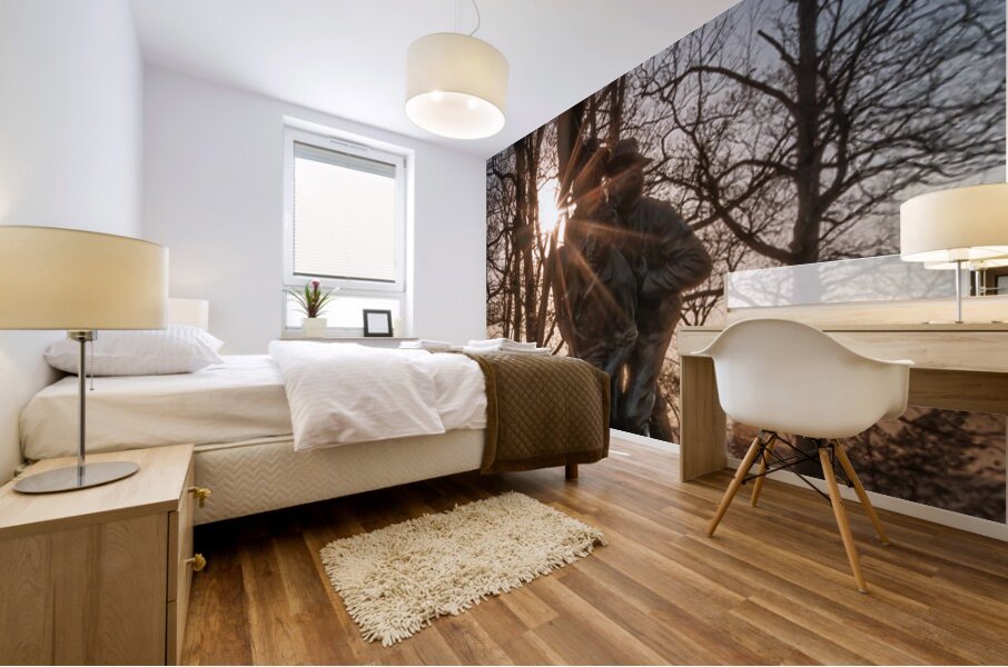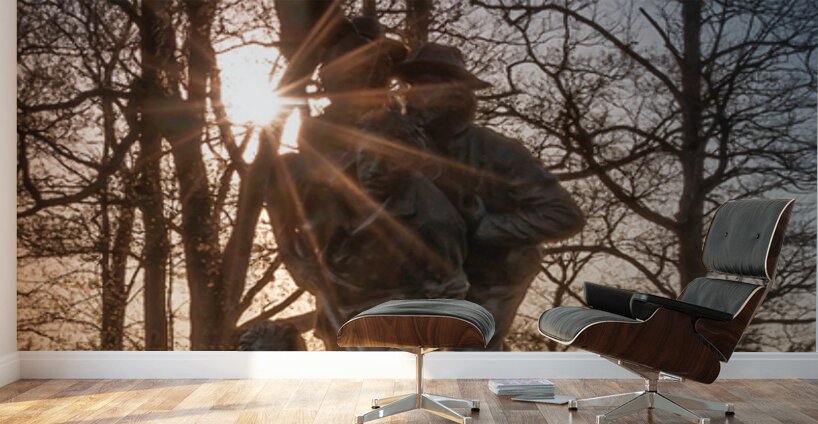 Step into a world of valor and resilience with this captivating artwork titled Stand Together Move Forward. The bronze statue stands tall depicting a group of military figures united in solidarity against all odds. The intricate details of their uniforms and expressions convey a sense of camaraderie and unwavering determination. As the sun casts its warm glow over the scene the figures come to life seemingly ready to take on any challenge that comes their way. The play of light and shadows adds depth and dimension to the sculpture enhancing its powerful presence. Surrounded by a sturdy metal fence the artwork stands as a symbol of strength and protection amidst lush trees and an expansive sky. The juxtaposition of the figures against the natural elements creates a striking contrast emphasizing the bravery and companionship depicted in the piece. Experience the beauty and poignancy of this stunning artwork where valor and unity reign supreme. Each viewing offers a new perspective inviting viewers to reflect on the resilience and sacrifice of those who stand together in the face of adversity. Stand Together Move Forward is a testament to the human spirit and an homage to the unbreakable bond forged through shared experiences.