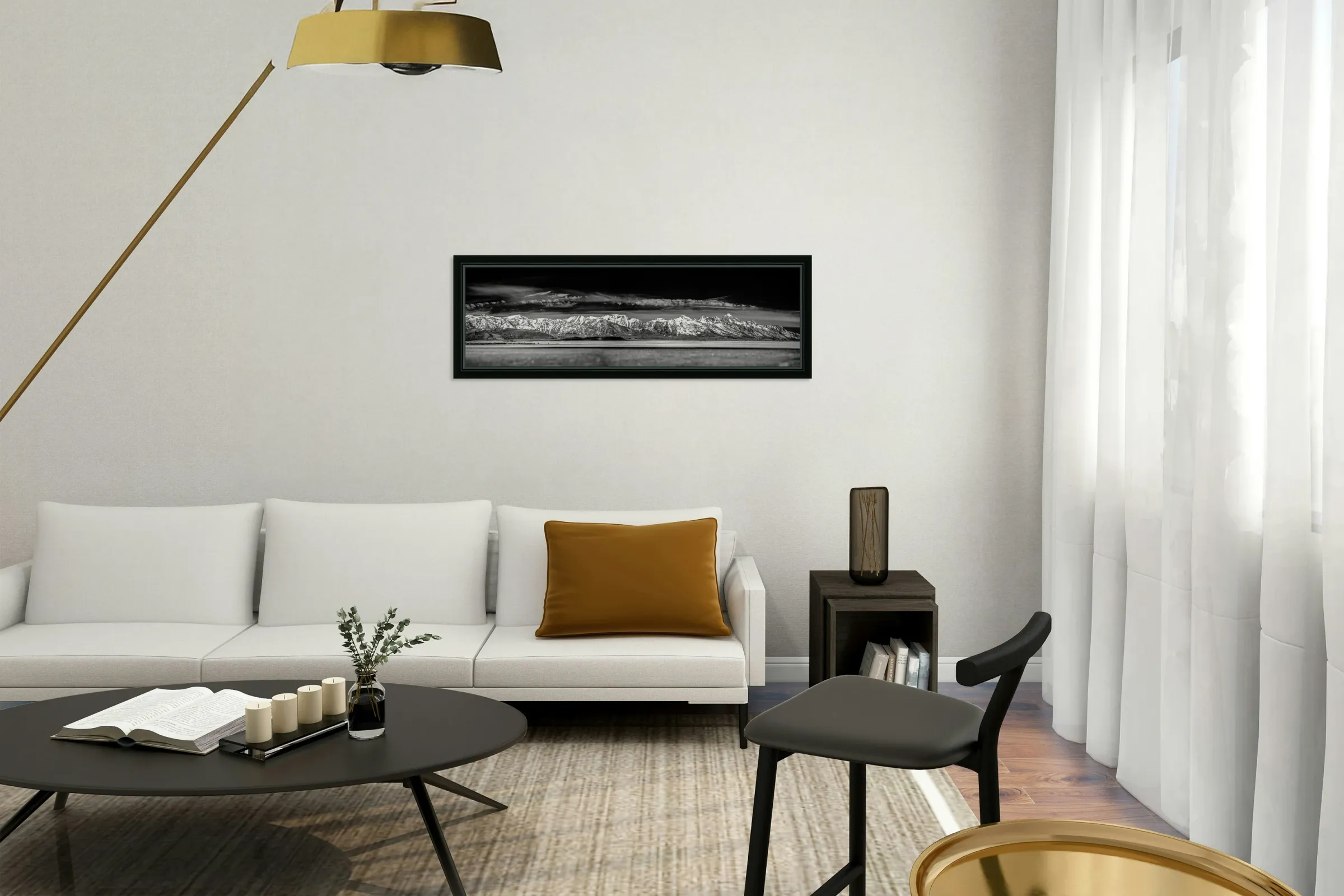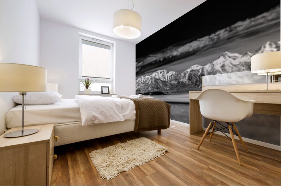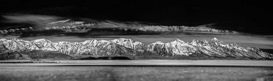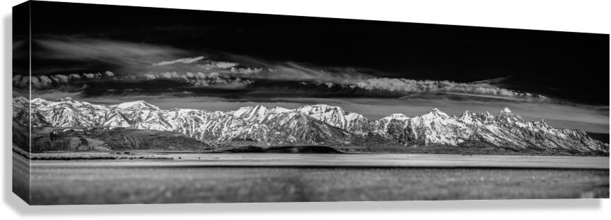 In winters embrace the Tetons rise like natures cathedral their snow-draped peaks gleaming against dramatic skies. Through infrared photography these ancient mountains transform into a monochromatic masterpiece where light and shadow dance across geological time. Part of the Shades of Light & Shadow collection this image celebrates the raw majesty of Wyomings crown jewels.
