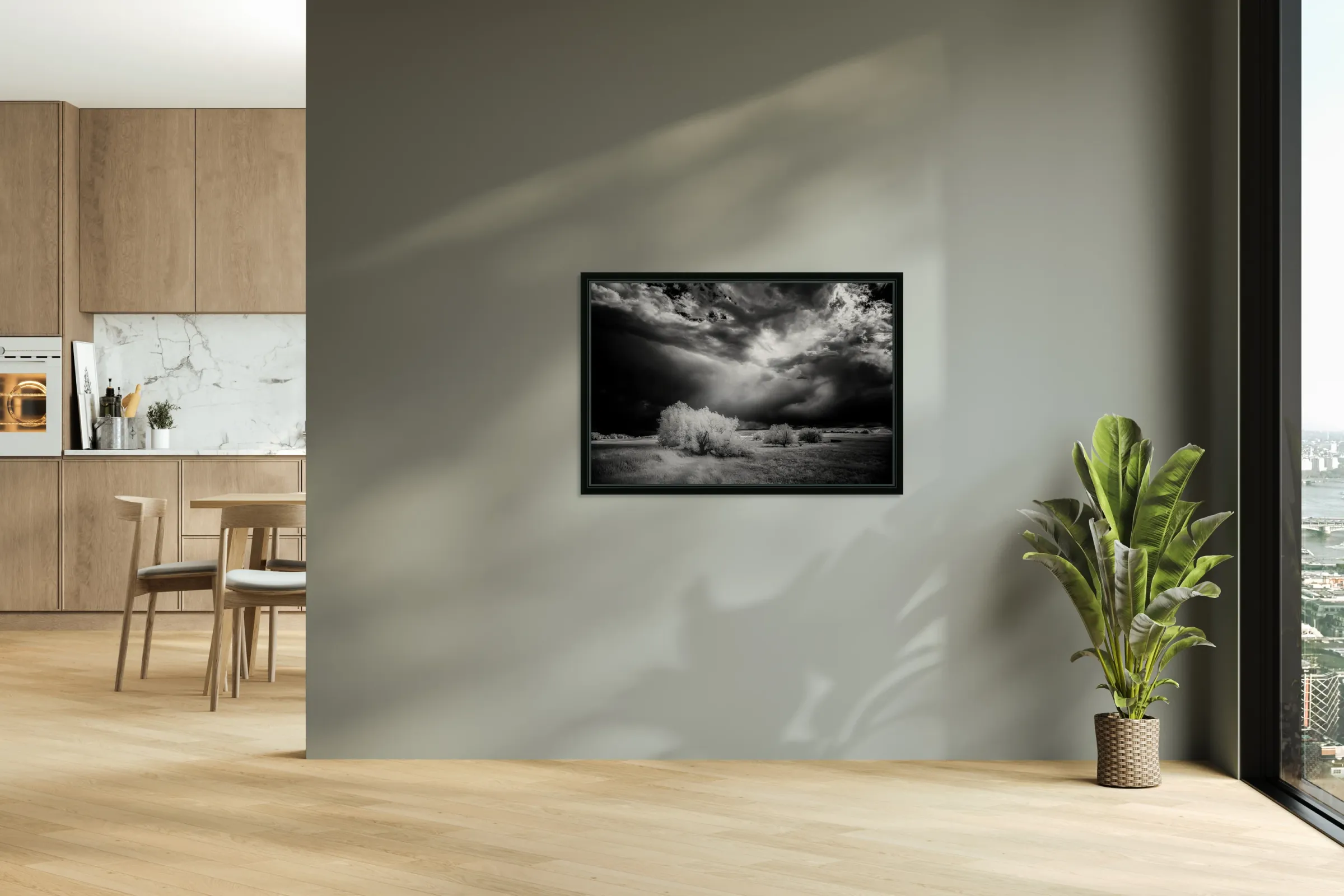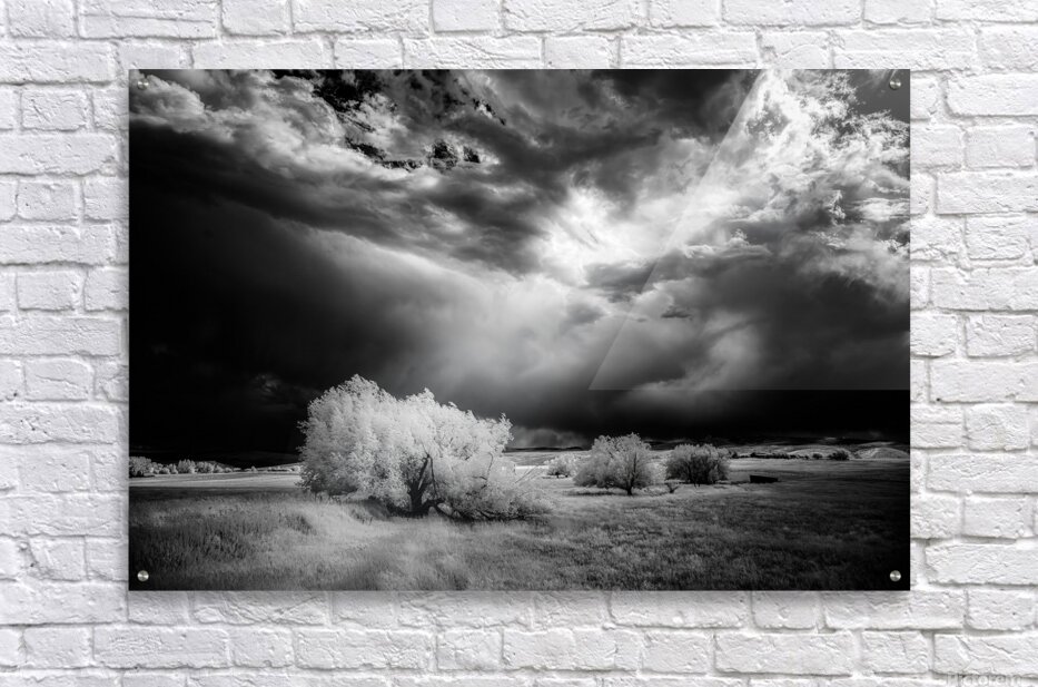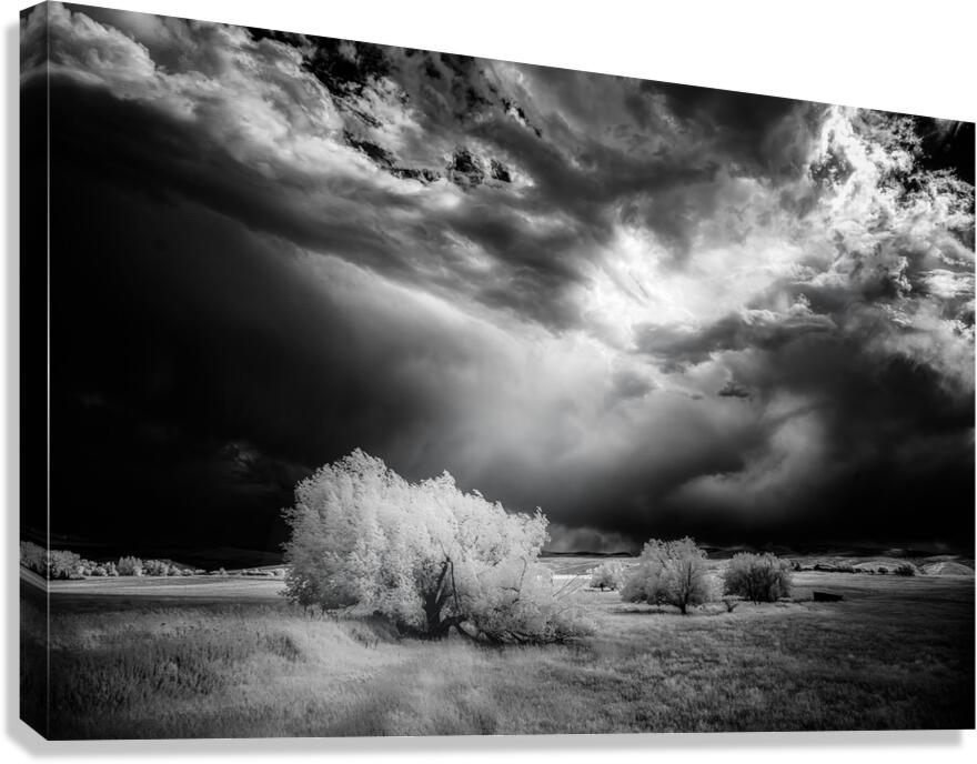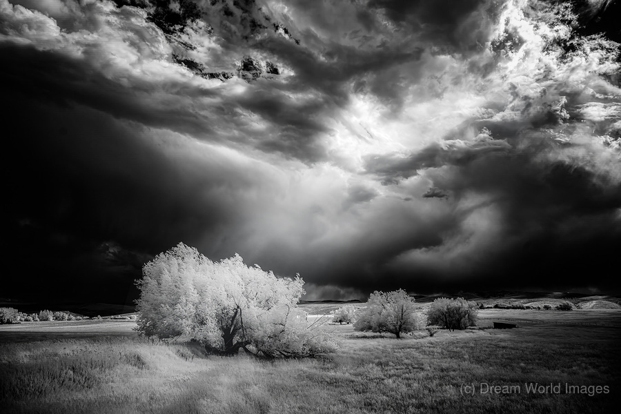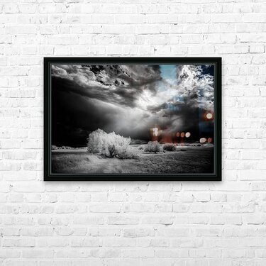 Sometimes nature puts on a show that humbles every photographer who witnesses it. This moment in Wyoming felt like standing in a cathedral where the ceiling had been replaced by storm clouds and divine light. The infrared treatment transforms those luminous sagebrush into ghostly sentinels while dramatic rays of sunlight pierce through the tempest above. Its the kind of scene that makes you believe in something bigger than yourself - where the raw power of prairie storms meets the quiet resilience of desert plants that have weathered countless such displays. Standing here you realize youre not just taking a photograph youre documenting a conversation between earth and sky.