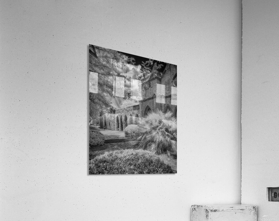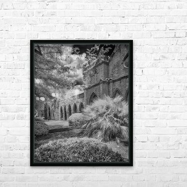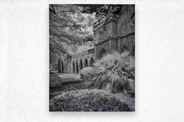Immerse yourself in the timeless allure of St. James Episcopal Church in the heart of Eufaula Alabama unveiled through the lens of a captivating black and white infrared photograph. This visual journey transcends the ordinary inviting you into an enchanting embrace where the very soul of the church is laid bare. The ivy-covered walls adorned with intricate details become a living canvas as they gracefully unfold in monochromatic splendor. Each tendril of ivy tells a story weaving a tapestry of textures that adds an ethereal elegance to the scene. The play of light and shadow accentuates the architectural nuances bringing forth the churchs history and character in a silent visual symphony. In the foreground a small bush stands as a humble yet significant presence contributing to the composition with its delicate silhouette. Against the stark black sky a dramatic backdrop unfolds serving as a canvas that accentuates the ethereal beauty of St. James Episcopal Church. The dark expanse magnifies the intricate details creating a chiaroscuro effect that heightens the overall atmospheric impact. Nature seemingly with artistic intent positions the surrounding trees to frame the entrance of the church. Their branches extend like welcoming arms adding a touch of mystique to this atmospheric portrayal. The juxtaposition of natural elements against the architectural grandeur creates a harmonious balance transforming the photograph into a visual poem. As you step into this enchanting visual narrative the very spirit of St. James Episcopal Church comes alive. The black and white infrared treatment not only captures the physical form of the church but also reveals its intangible essence. It becomes a portal into a realm where time seems to stand still and the delicate dance of light and shadow narrates the sacred stories etched within the hallowed walls.
