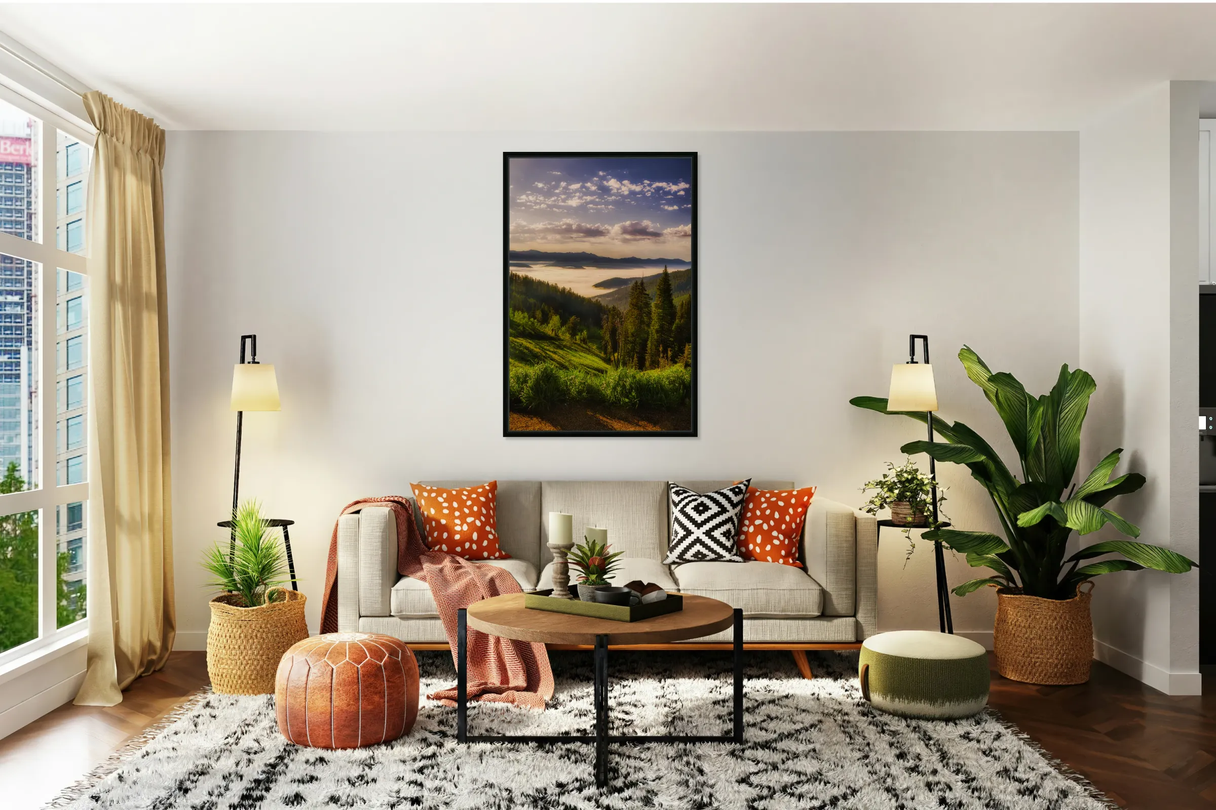 Imprimé jusqu’au bord et prêt à être accroché, avec un cadre flottant à l’arrière.