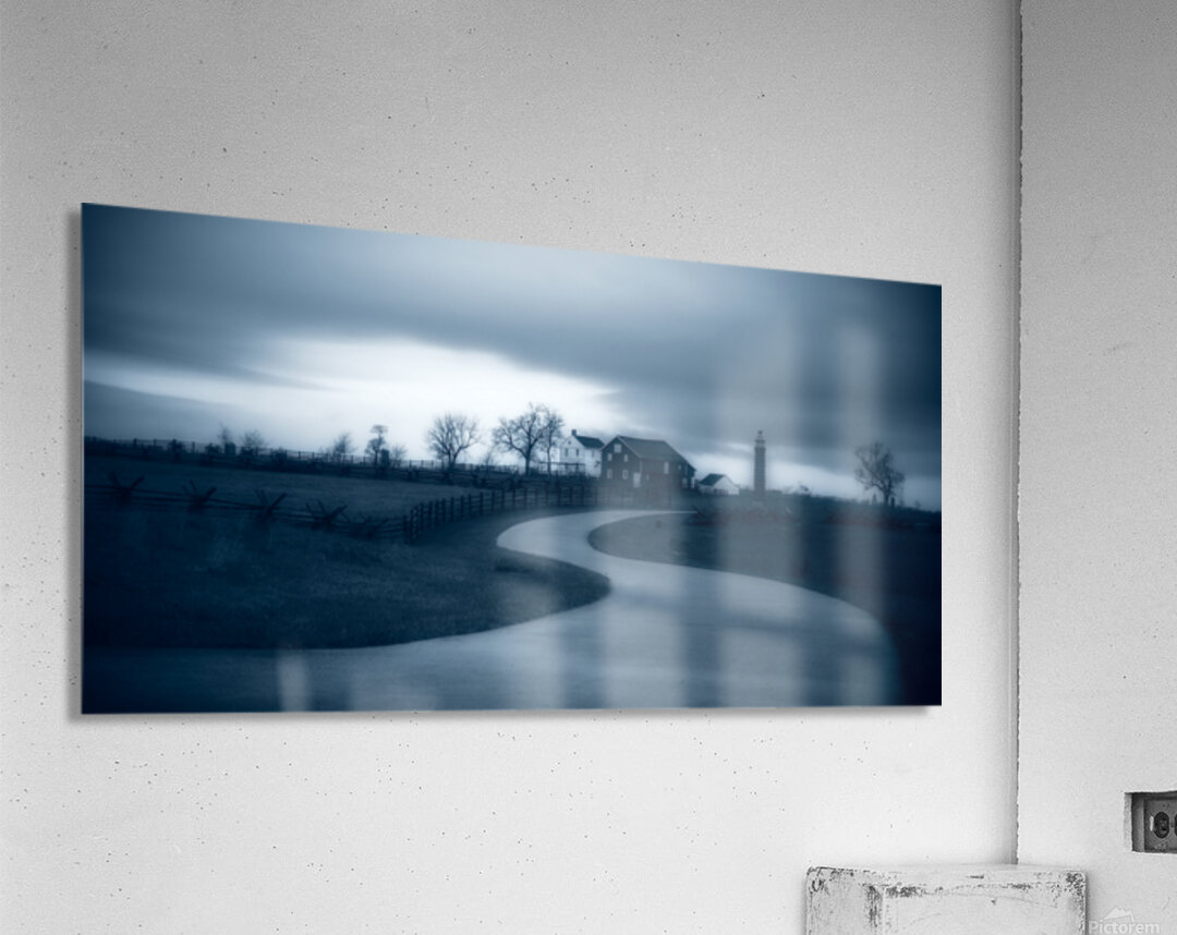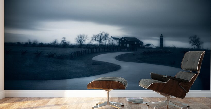 A pale road curves through the battlefield like a slow deliberate thought leading the eye toward a farmhouse and a lone monument standing under a heavy storm-dark sky. The fences and bare trees feel like quiet witnesses keeping their places while the light shifts and the clouds gather. There’s a strange calm in the scene—an uneasy stillness that suggests the land is holding memory just beneath the surface. It’s not a loud image it’s a listening one where the path forward feels both physical and symbolic inviting you to move gently through history and feel the weight of what remains.
