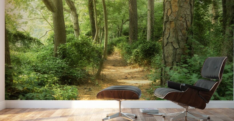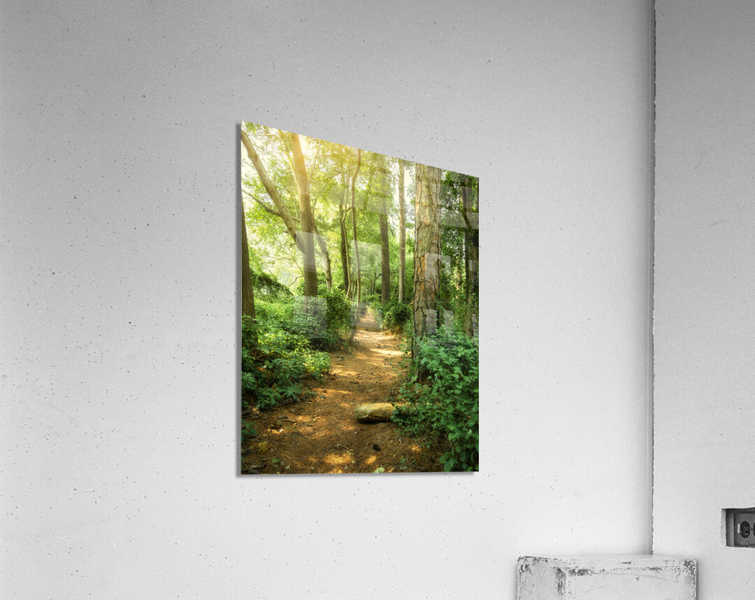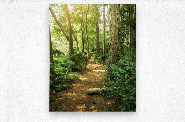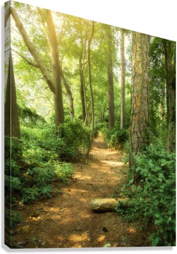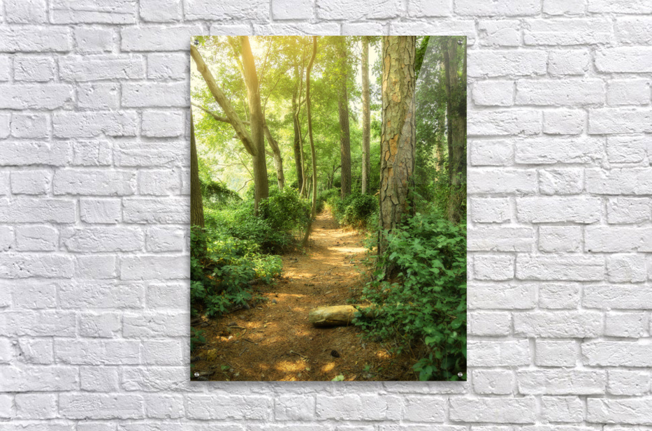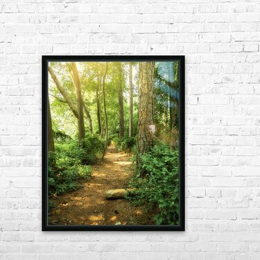 Entitled "Whispers Along the Sunlit Path," this mesmerizing photograph unveils a hidden realm of serenity within a forest scene. The image captures a meandering dirt path that gently winds its way through the dense, emerald green foliage. Tall trees, their bark etched with time's intricate textures, stand as silent sentinels, guiding and guarding the journey ahead. Sunlight, ethereal and golden, filters through the lush canopy above, casting a spell of warm illumination on the path below. The delicate interplay of light and shadow weaves a tapestry of tranquility and invitation, drawing the viewer into a world of peace and contemplation. This enchanted forest, bathed in nature's splendor, whispers secrets of stillness and serenity, inviting one to step onto the path and become a part of its timeless story.