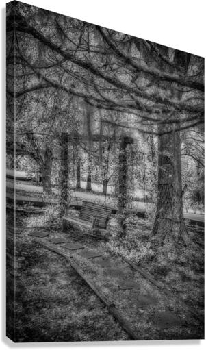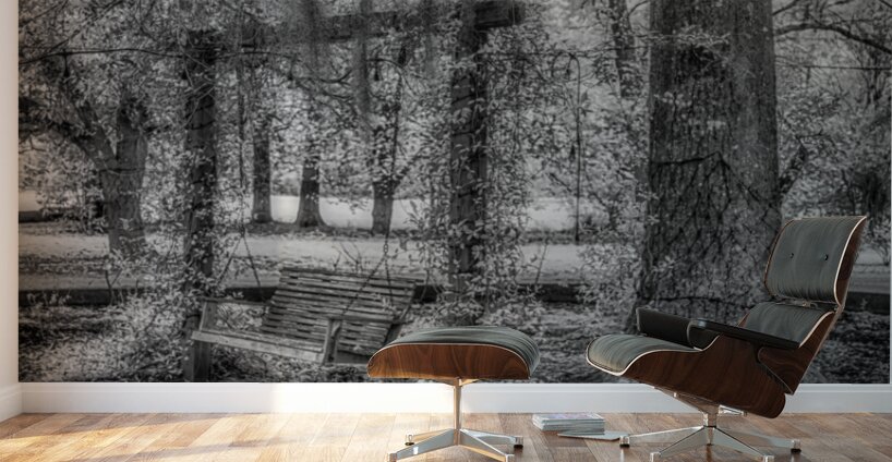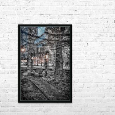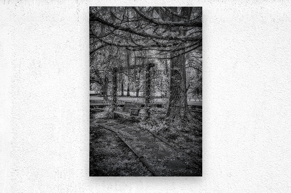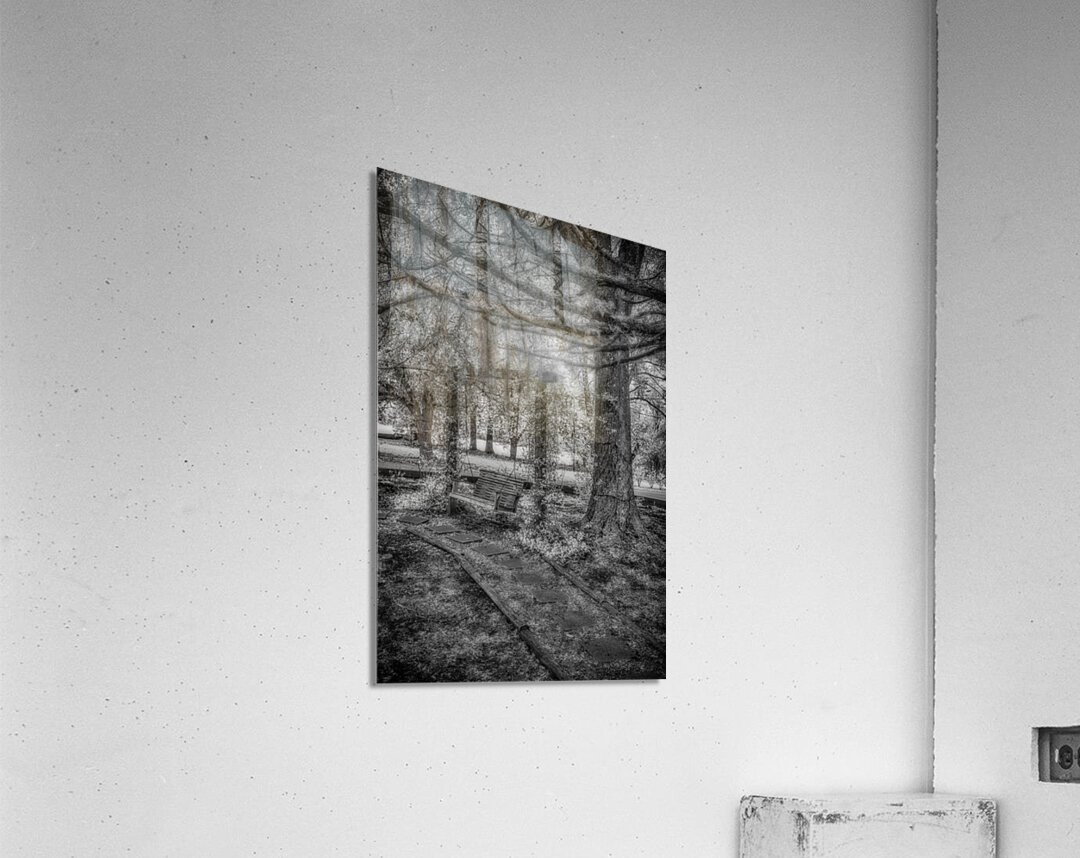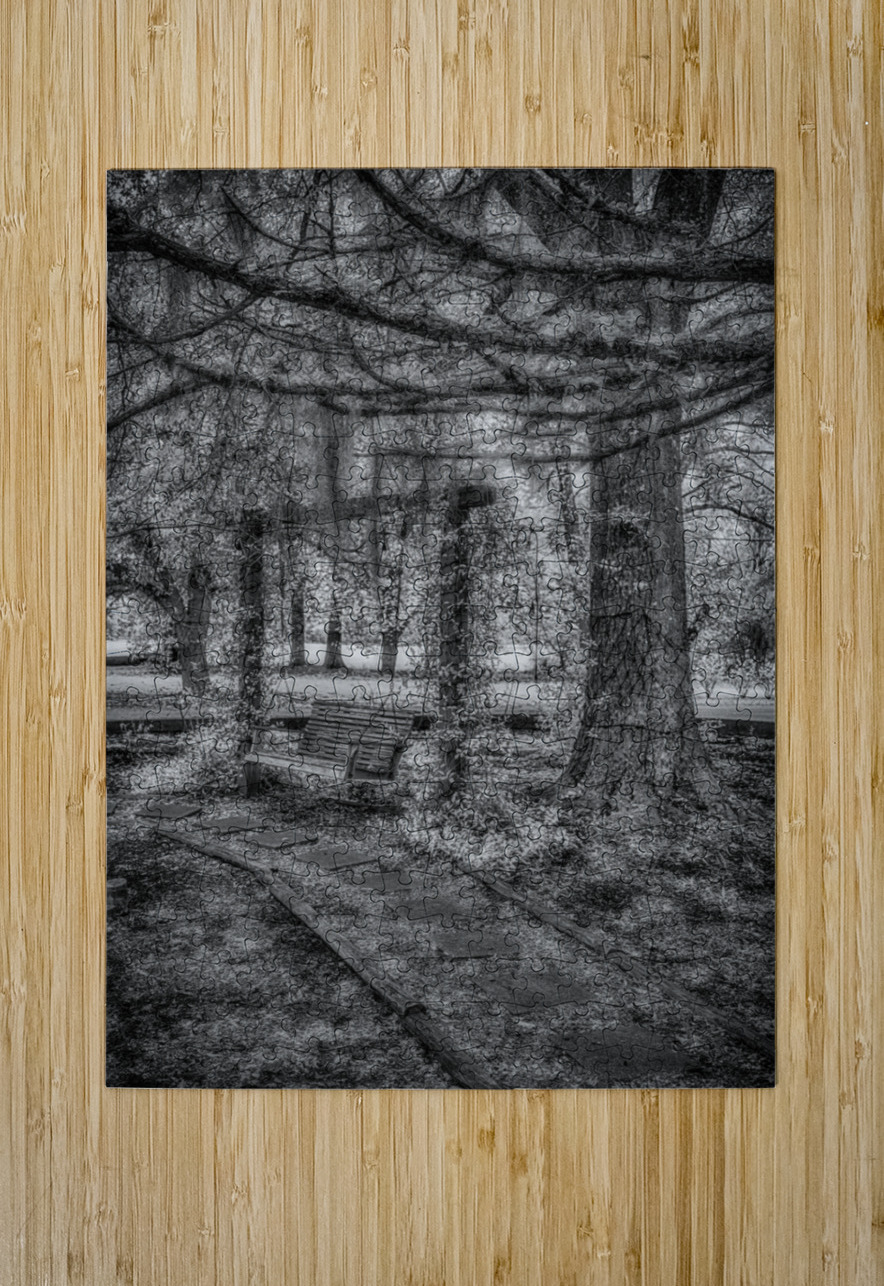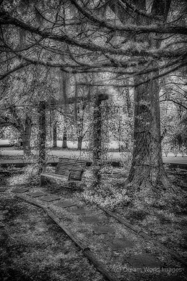 As we stayed in the quaint town of Holden, Louisiana, I stumbled upon a hidden gem nestled within the John Schneider Studio's property. This old garden swing held the echoes of time within its weathered frame. The image before me, captured in invisible light, revealed a scene of profound serenity and melancholy beauty. At the composition's heart stood an ancient wooden bench hanging by chains from the branches of a majestic tree, its weathered surface bearing the marks of countless seasons gone by. Partially surrounded by overgrown plants and unruly foliage, the swing exuded an aura of abandonment, as if nature had reclaimed it as her own. Stepping stones, worn and buried beneath layers of earth, led the way to this forgotten sanctuary, guiding me through the wilderness toward the solitary swing. Towering trees framed the scene, their thick trunks and textured bark bearing witness to the passage of time. In the distance, a hint of a clearing or meadow bathed in soft, ethereal light offered a glimpse of the world beyond—where time seemed to stand still and nature reigned supreme. The monochrome photograph's absence of color only enhanced the melancholic and serene atmosphere, inviting me to reflect on the ephemeral nature of existence and the timeless dance of decay and renewal. As I entered this enigmatic realm, I couldn't help but lose myself in the echoes of a bygone era, where the echoes of time whispered through the rustling leaves and the gentle sway of the garden swing. It was a profound connection with nature and a reminder of the beauty in the cycle of life and decay.
