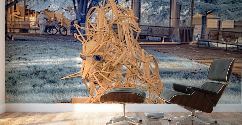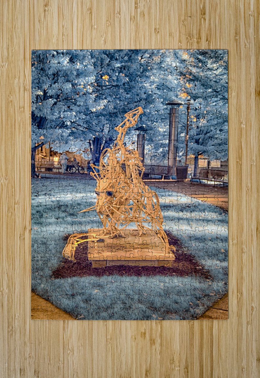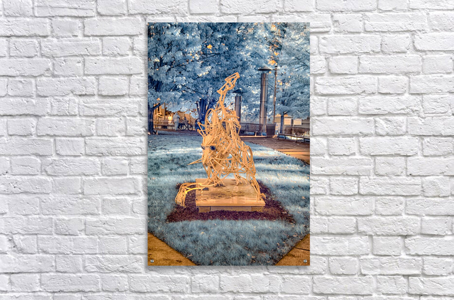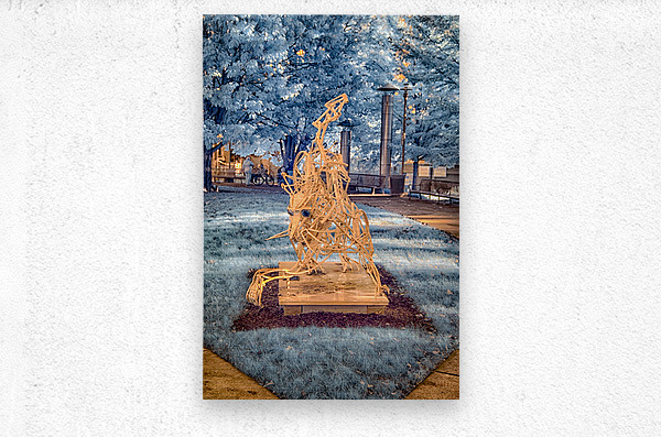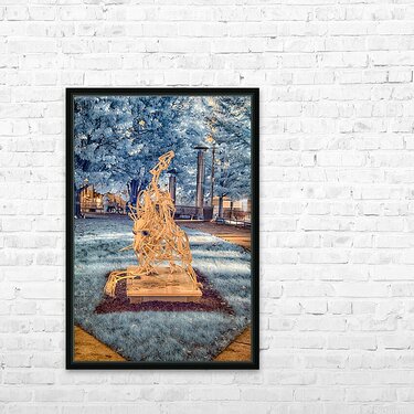 In the heart of York, Pennsylvania, where art meets urban renewal, I discovered these sculptural dancers caught in infrared's enchanting gaze. Through my lens, the familiar bronze figures transform into something otherworldly - their metallic forms glowing a warm copper against a backdrop of silvery-blue foliage. The sculpture, part of York's public art initiative, takes on new life through infrared vision. Each twisted form seems to radiate its own inner energy, the metal catching and holding light in ways invisible to the naked eye. The surrounding landscape shifts into cool tones of azure and indigo, creating a dreamlike stage for these frozen dancers. Some say art reveals its deepest secrets when viewed through different light. On this day, as my infrared camera captured wavelengths beyond human vision, I witnessed that truth. This isn't just public sculpture - it's a celebration of movement and form, where metal and light collaborate to create something that exists between the real and the surreal.