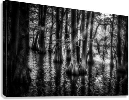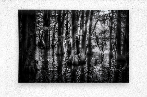 An infrared image of bald cypress trees with the sun shine trying to come thru the clouds in Santee SP - South Carolina.