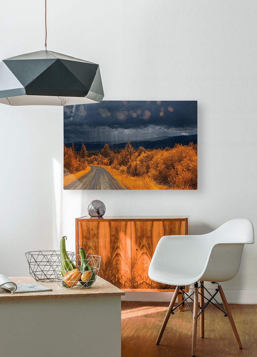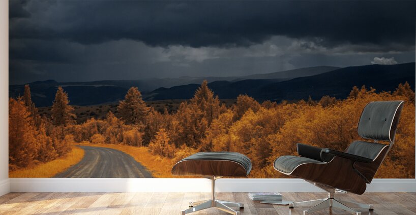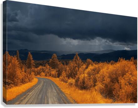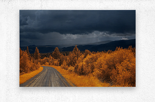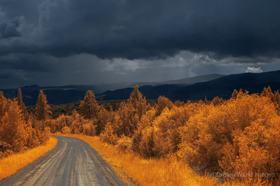 Embarking on the scenic descent from Elkhorn, Montana, a journey unfolds through the lens of "Epic Descent: Montana's Infrared Mountain Road." This vibrant infrared capture transforms the road into a vivid passage, illuminated by the radiant glow of nearby foliage painted in bright orange hues. As your gaze stretches into the distance, the scene morphs into a dramatic theater of nature. Dark storm clouds swirl with textured intensity, setting the stage for a mesmerizing play between light and shadow. The rolling mountains, dressed in layers of infrared enchantment, come alive as rain gently kisses their slopes. A focal point slightly off-center reveals a captivating interplay of thick clouds and diffused light, creating an ethereal atmosphere that beckons exploration. This stunning image encapsulates the essence of Montana's diverse landscapes, where every twist and turn on the mountain road reveals a new chapter in the unfolding drama of nature.