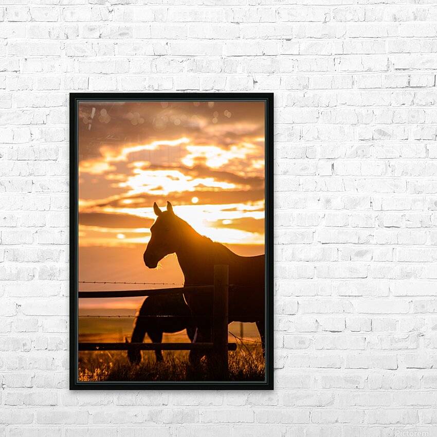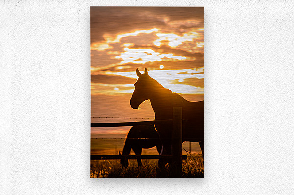 As the sun dips below the horizon, casting its golden rays across the landscape, a lone silhouette stands in quiet contemplation. Against a backdrop of swirling clouds and radiant hues of orange and yellow, the majestic figure of a horse emerges, bathed in the warm glow of dusk. Framed by a rustic fence of weathered wood and barbed wire, the horse exudes a sense of grace and strength, as if rooted in the timeless beauty of the natural world. The play of light and shadow creates a mystical aura around this enigmatic creature, inviting the viewer to pause and ponder the mysteries of the twilight hour.  With a mane that seems to dance in the evening breeze, the horse appears almost ethereal, a symbol of freedom and untamed beauty. Its eyes, reflecting the last remnants of daylight, hold a depth of wisdom that seems to speak to the soul. The soft, earthy tones of the landscape contrast with the vivid colors of the sky, creating a mesmerizing scene that captures the essence of a tranquil evening in the countryside. In this moment of fleeting beauty, the viewer is transported to a realm where tranquility and wonder reign supreme. The serenity of the scene is enhanced by the sounds of nature, the rustling of leaves and the distant call of a bird, adding layers of depth to the experience. The artist has masterfully captured the magic of twilight, inviting viewers to immerse themselves in the quiet splendor of the natural world.