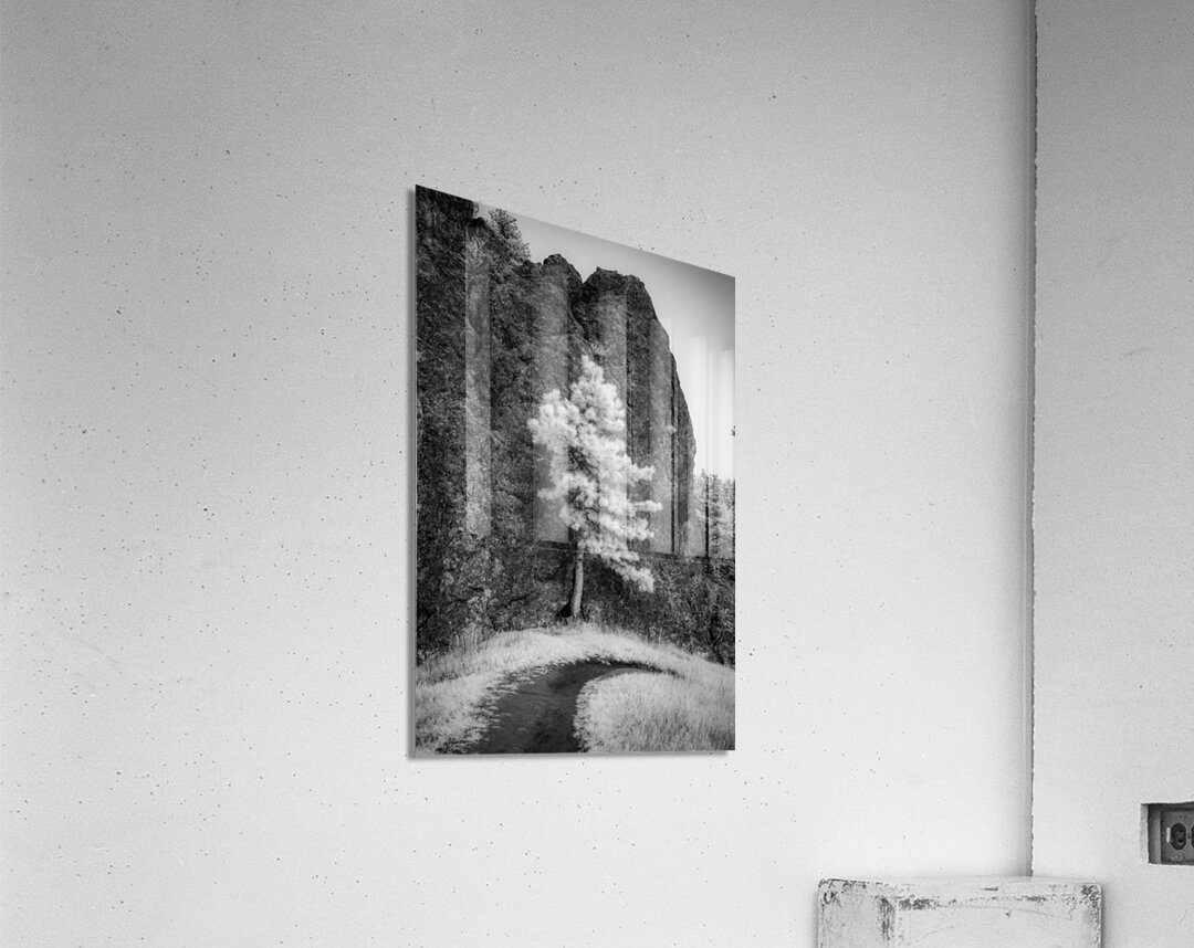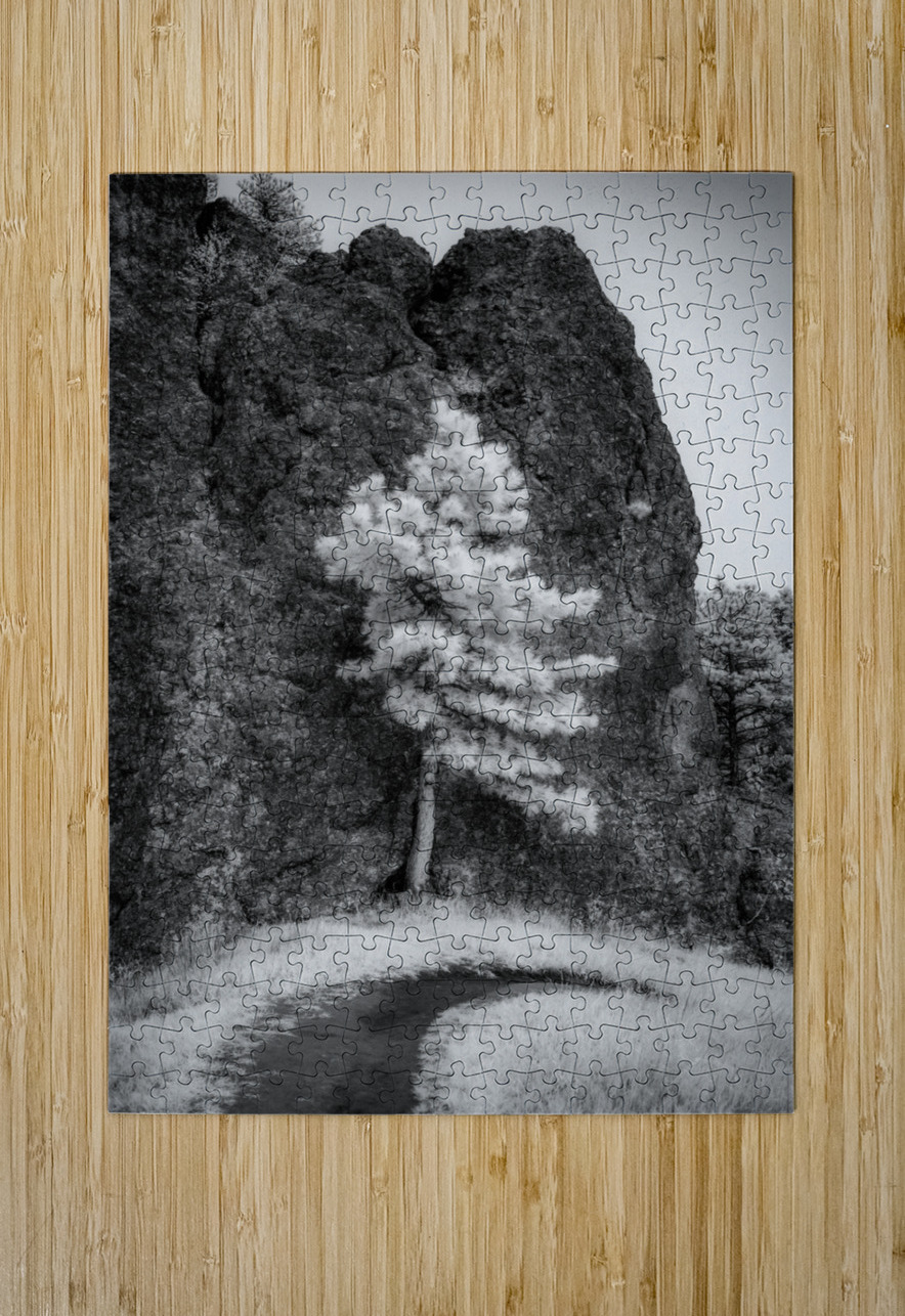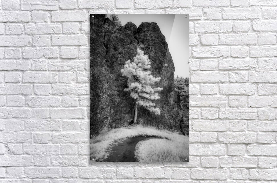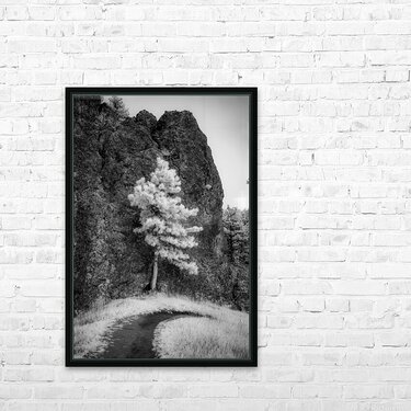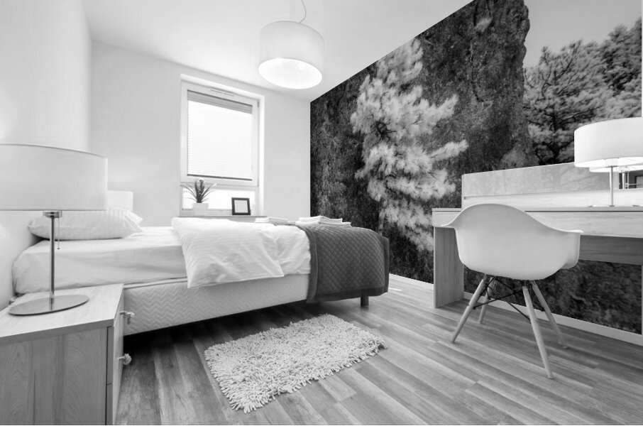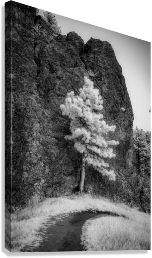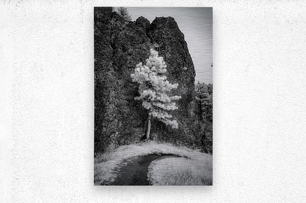 An invsible light image of a pine tree standing tall against a massive rock formation. It looks like the tree is holdin up the rock.