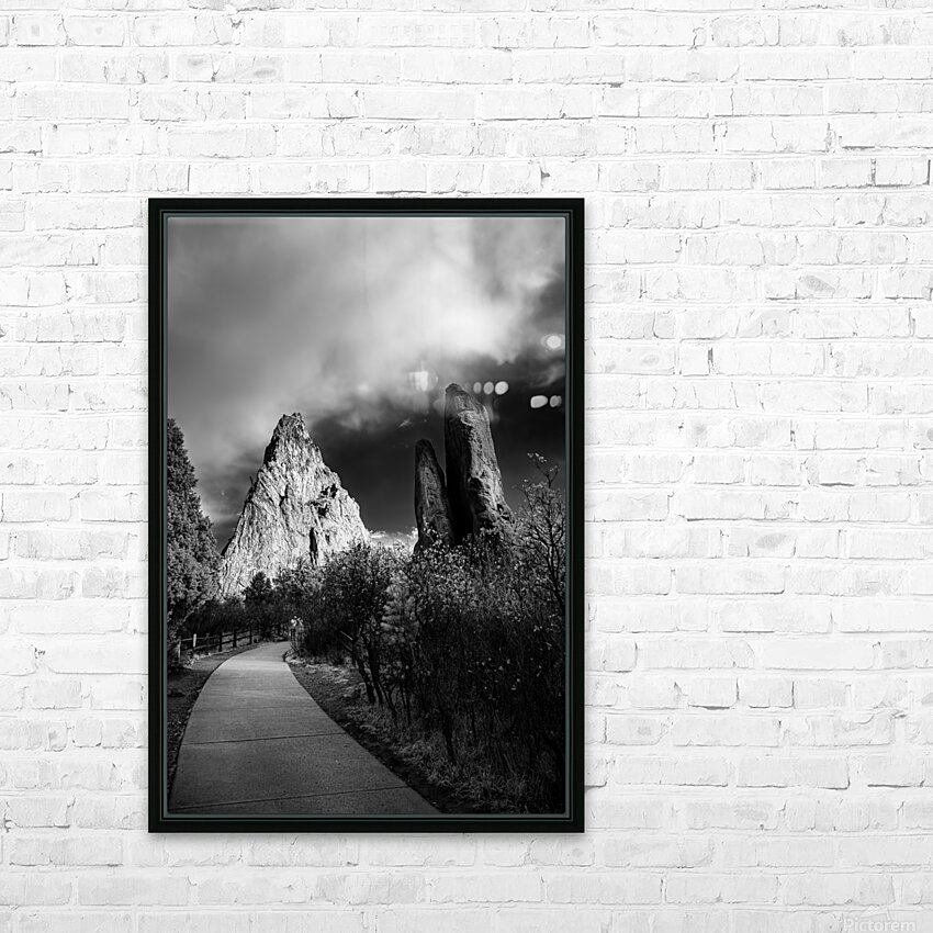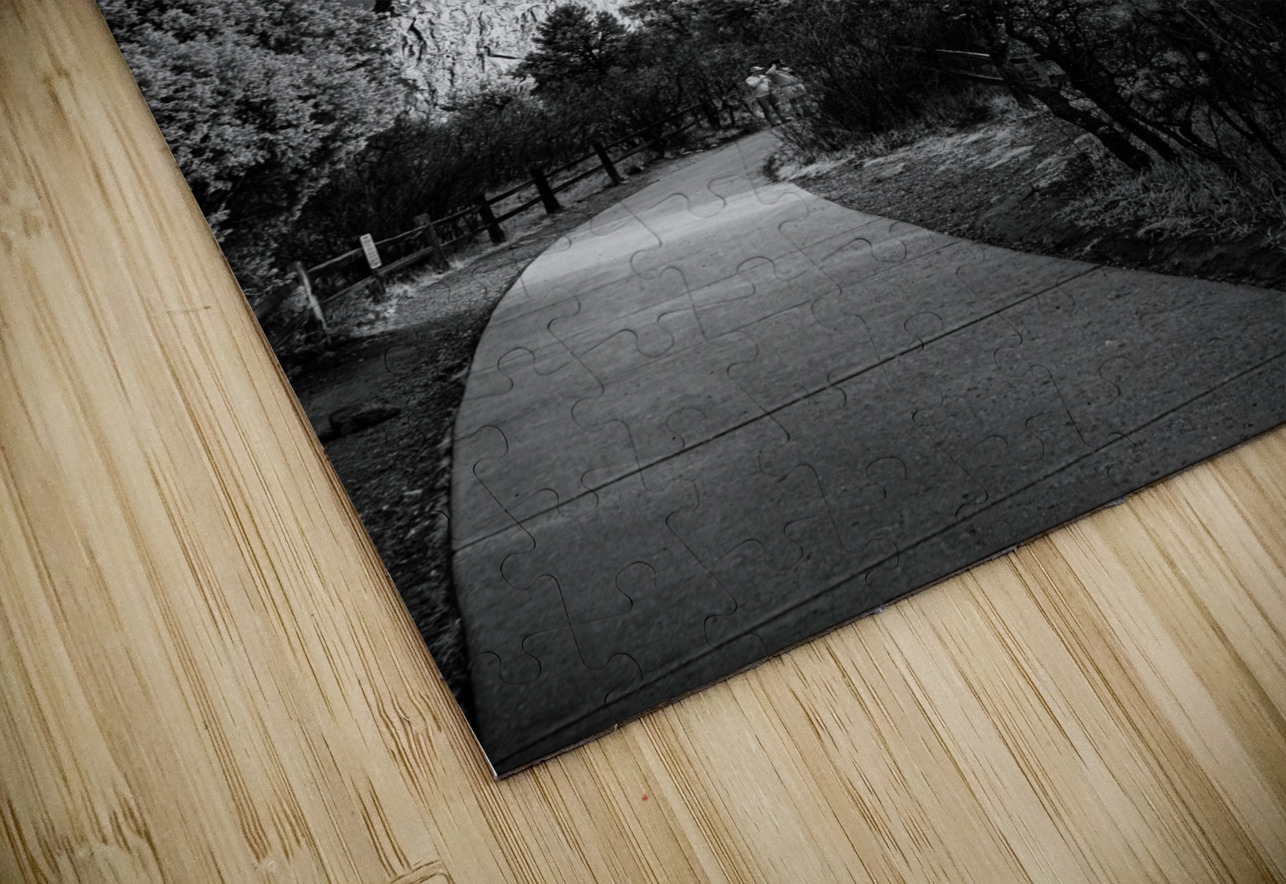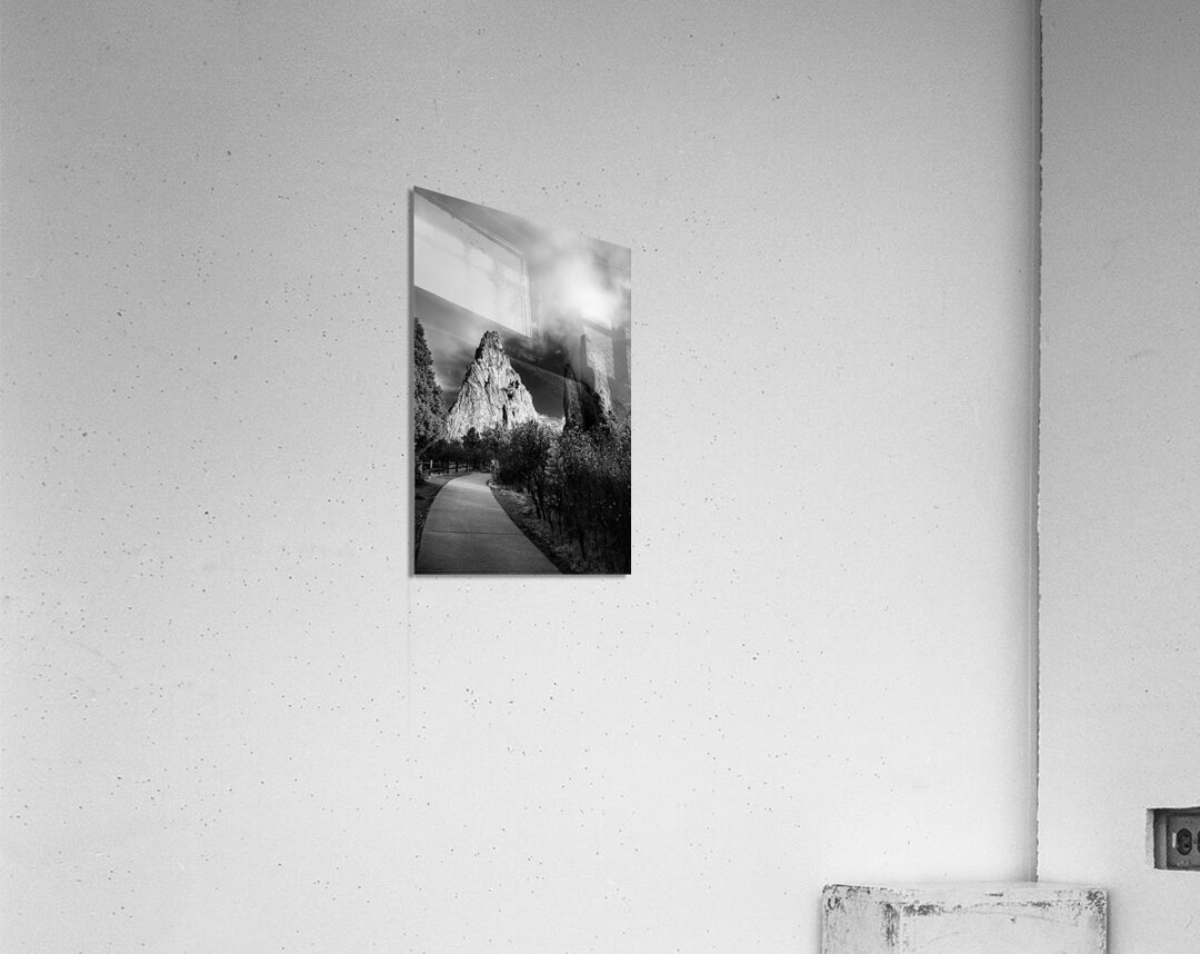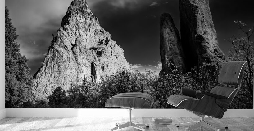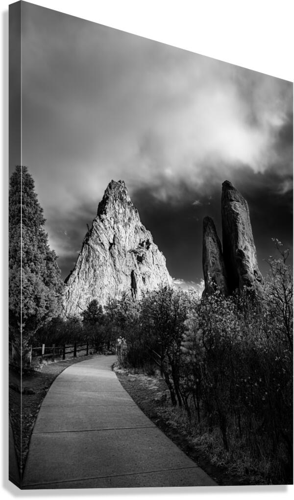 In early spring at Garden of the Gods in Colorado, a captivating black and white infrared image captures a winding path amidst colossal rock outcrops....[+]