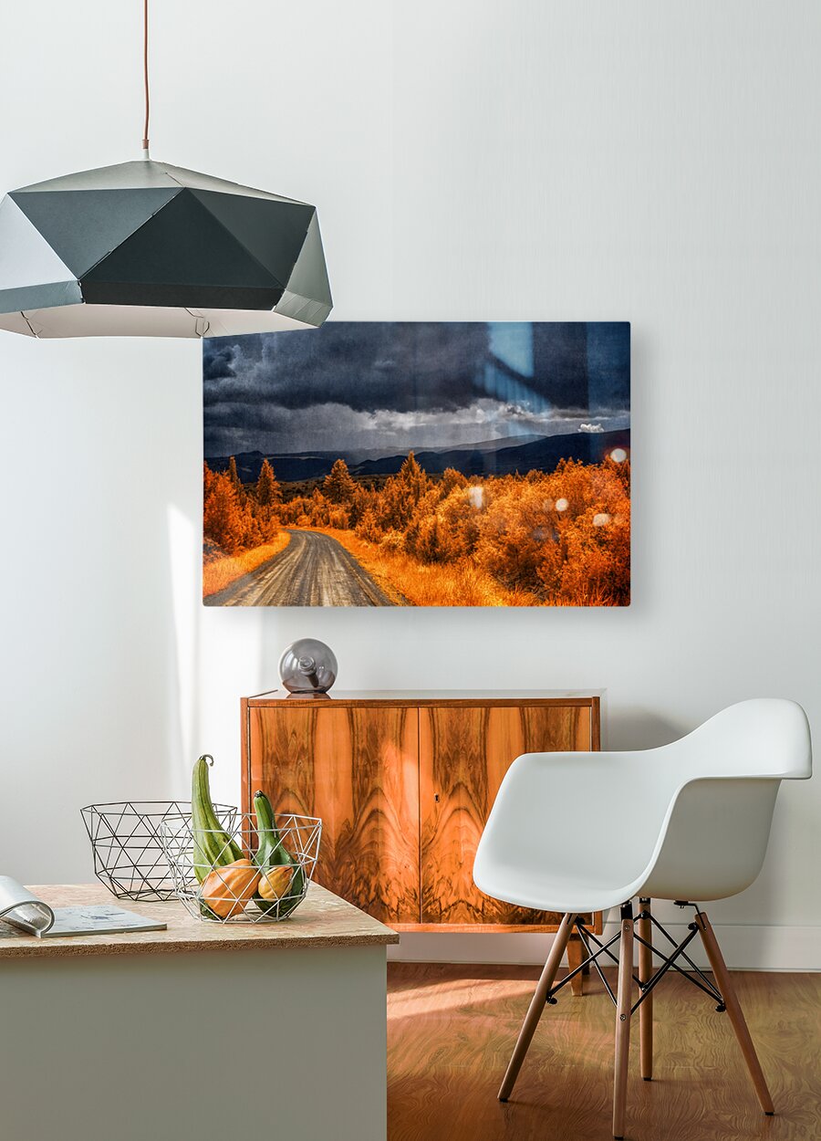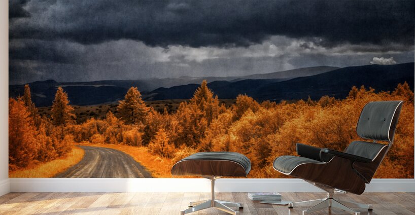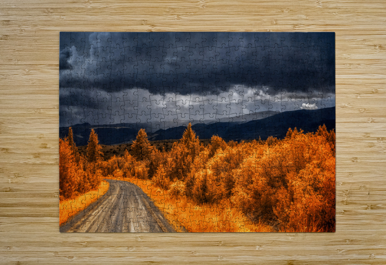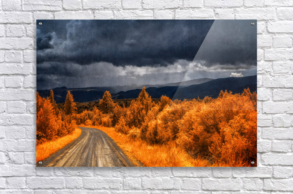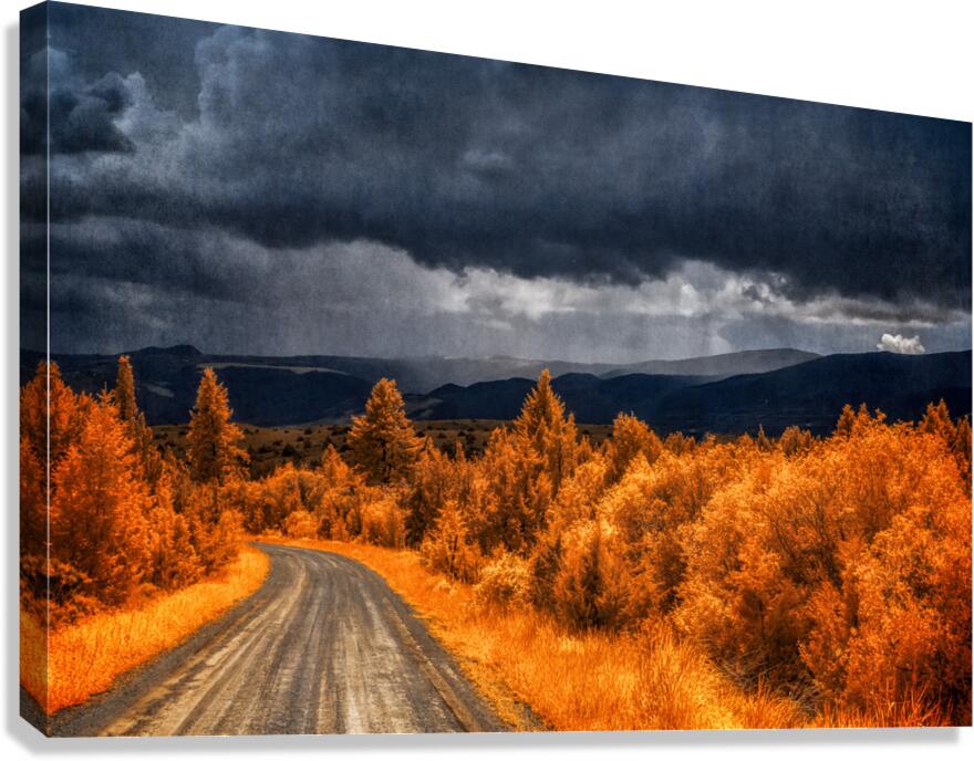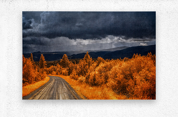 Embarking on the scenic descent from Elkhorn Montana a journey unfolds through the lens of Epic Descent: Montanas Infrared Mountain Road. This vibrant infrared capture transforms the road into a vivid passage illuminated by the radiant glow of nearby foliage painted in bright orange hues. As your gaze stretches into the distance the scene morphs into a dramatic theater of nature. Dark storm clouds swirl with textured intensity setting the stage for a mesmerizing play between light and shadow. The rolling mountains dressed in layers of infrared enchantment come alive as rain gently kisses their slopes. A focal point slightly off-center reveals a captivating interplay of thick clouds and diffused light creating an ethereal atmosphere that beckons exploration. This stunning image encapsulates the essence of Montanas diverse landscapes where every twist and turn on the mountain road reveals a new chapter in the unfolding drama of nature.