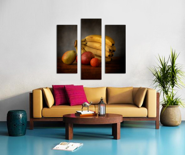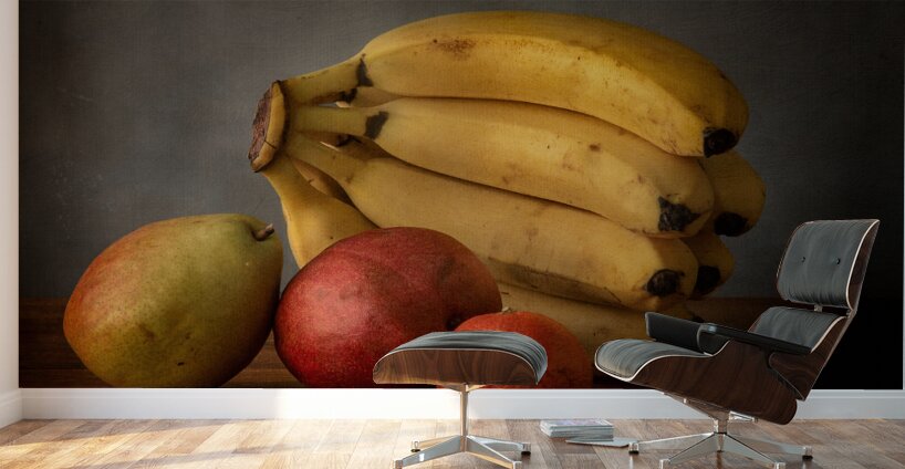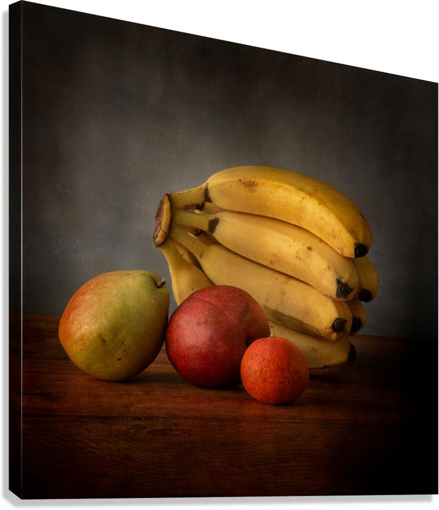 SUR CETTE OEUVRE: BOUNTIFUL MEDLEY: BANANAS BEHIND GREEN PEAR RED PEAR AND ORANGE