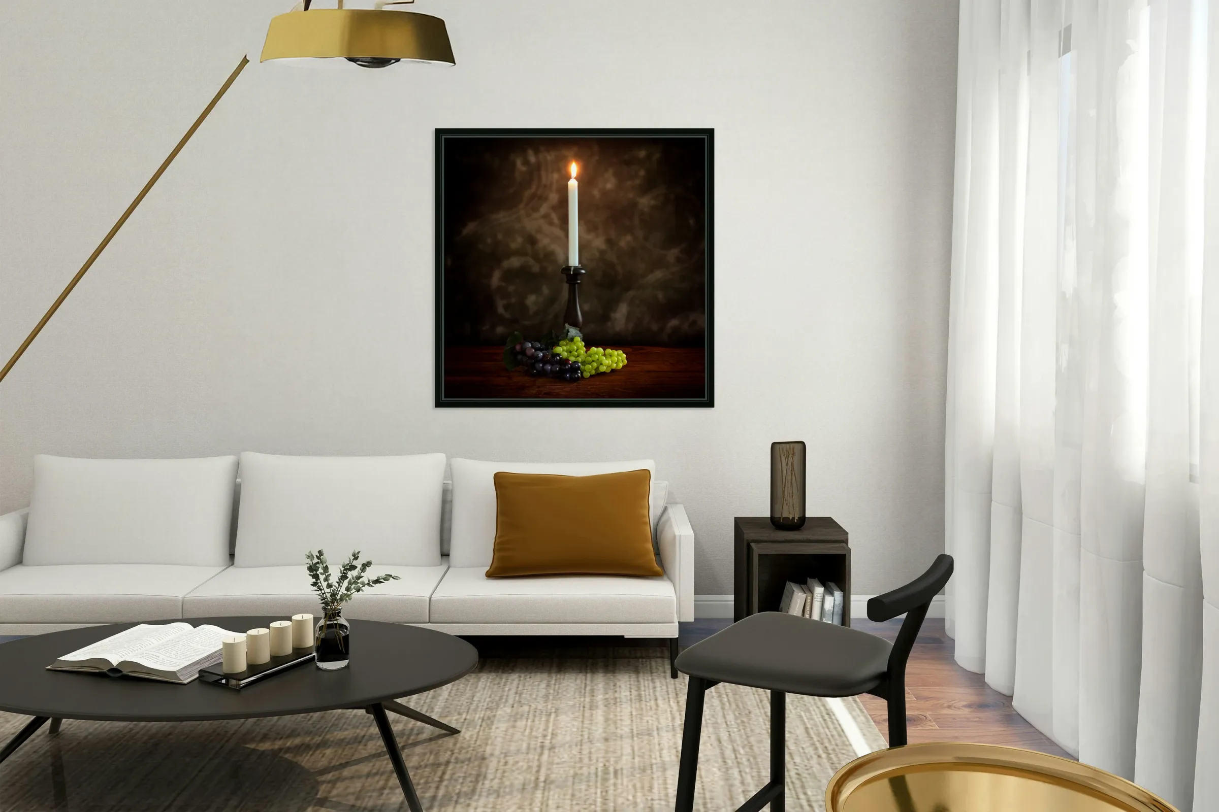SUR CETTE OEUVRE: VINTAGE ILLUMINATION: ANTIQUE CANDLESTICK WITH GRAPES AND FLAME
