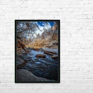 Step into a world where nature whispers its secrets and the river flows with a mesmerizing energy. Riverside Whispers transports you to a place of ethereal beauty where the golden hues of the trees dance against the deep blues of the flowing water. The swirling patterns and cascading currents create a sense of movement that is both serene and alive. Light filters through the trees highlighting the enchanting textures and details of the landscape. This photograph captures a moment of unearthly magic inviting you to explore its mysteries and immerse yourself in its captivating allure.