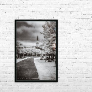 Step into a world of enigmatic beauty and spiritual splendor with my latest artwork Spiritual Splendor - A Journey with Dramatic Peace. This monochromatic infrared-style depiction offers a profound representation of lifes journey from birth to death. At the scenes forefront stands a majestic church with a towering steeple symbolizing the ultimate destination at the end of lifes winding road. A journey of contemplation and reflection lies along the path flanked by leafless trees illuminated by ethereal light. As the path leads towards the church it passes through a cemetery adorned with weathered gravestones reminding us of the lives once lived and the memories they leave behind. Above dark and moody clouds fill the sky adding a dramatic backdrop to the tranquil scene below. Inspired by the inner yearning for peace and solace this artwork captures a timeless moment where the spiritual realm meets the earthly. Using infrared techniques the scene is infused with an otherworldly quality inviting viewers to unravel the mysteries of existence. Join me on this journey of dramatic peace as we embrace the enigmatic beauty of Spiritual Splendor - A Journey with Dramatic Peace. Let us be transported to a place where serenity and contemplation reign and the soul finds solace in the depths of the unknown.