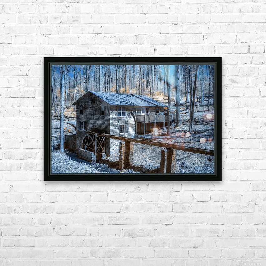 As I venture to Clarkson Covered Bridge in Cullman Alabama I find myself transported back in time to a place of wonder and history. Before me stands an old wooden mill its weathered siding and slanted metal roof catching the sunlight in a dance of light and shadow. The mill a true marvel is a sight to behold. Its prominent waterwheel a testament to human ingenuity is attached to a sturdy stone foundation. A wooden trough extends from the wheel directing water with purpose. The balconies and windows that grace the upper levels each with its own story to tell add to the mills rustic charm. Enveloping the mill is a serene forest terrain captured in a spectral blue tone that lends a tranquil otherworldly quality to the scene. The ground delicately dusted with fresh snow enhances the ethereal atmosphere. Despite the coolness of the blue filter the warmth of the mill radiates beckoning me closer with its timeless allure. As I soak in the serene atmosphere I cant help but appreciate the attention to detail in the photograph. The lighting accentuates the texture of the mills wooden surfaces and the rough stonework adding depth to the image. Its a journey back in time a glimpse into a bygone era preserved in the beauty of Clarkson Covered Bridge.