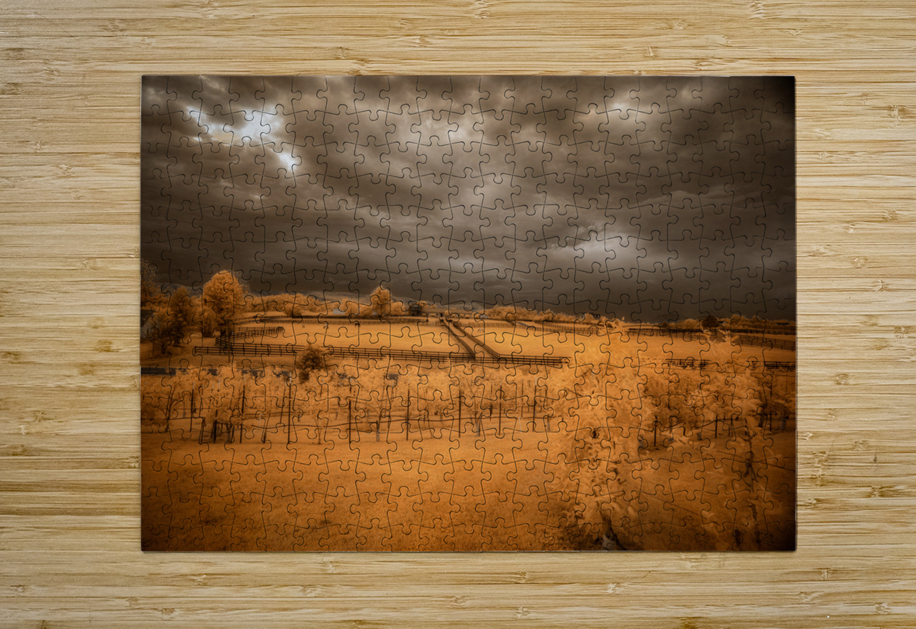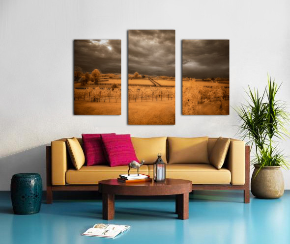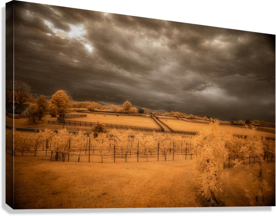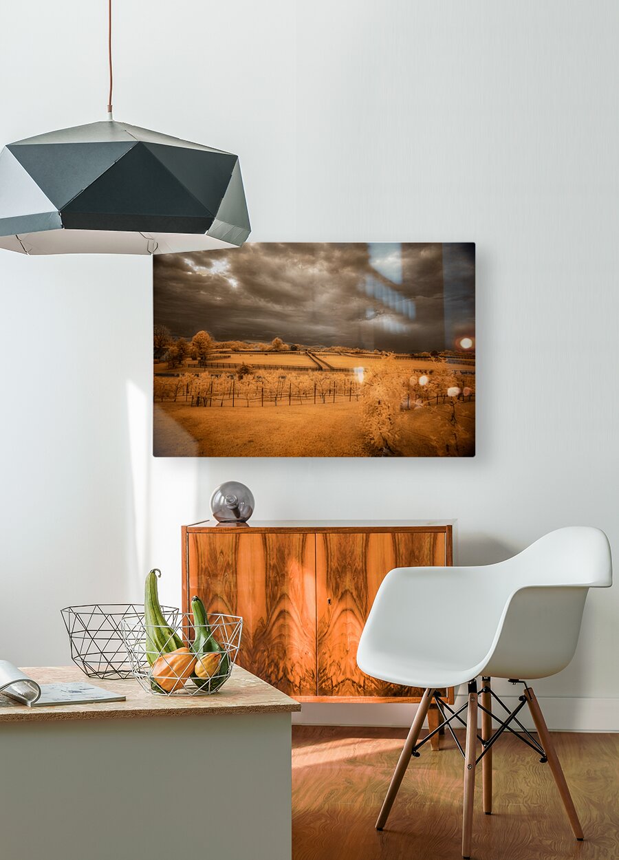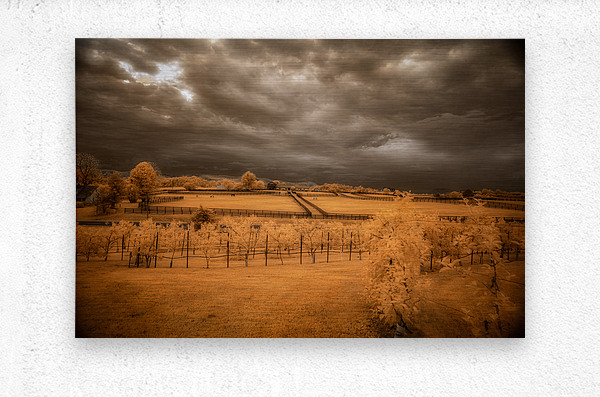 Step into a world where reality blurs with fantasy in Golden Vineyard. A mesmerizing landscape captured through the lens of an infrared technique this piece invites you to explore a realm of ethereal beauty and otherworldly charm. Imposing clouds dance with textured intensity in the sky casting shadows and light across fenced fields that descend in terraces creating a sense of depth and mystery. Whitish-glowing foliage adorns the scattered vegetation lending a surreal quality to the scene while rows of grapevines in a vineyard stand out against a vibrant golden and orange backdrop. The play of light and shadow the stark contrast between the dark sky and the glowing leaves and the overall atmospheric ambiance of the image draw you into a realm where reality and imagination intertwine. Golden Vineyard is a masterpiece that exudes a sense of quiet contemplation and transcendent beauty. It invites you to immerse yourself in its mystical allure and enigmatic charm.
