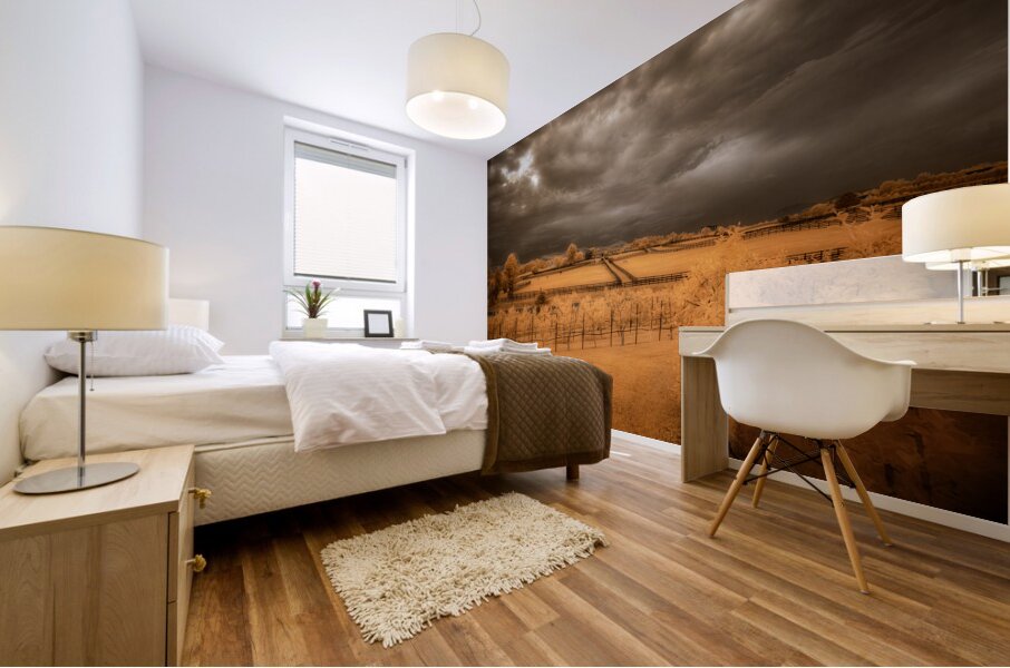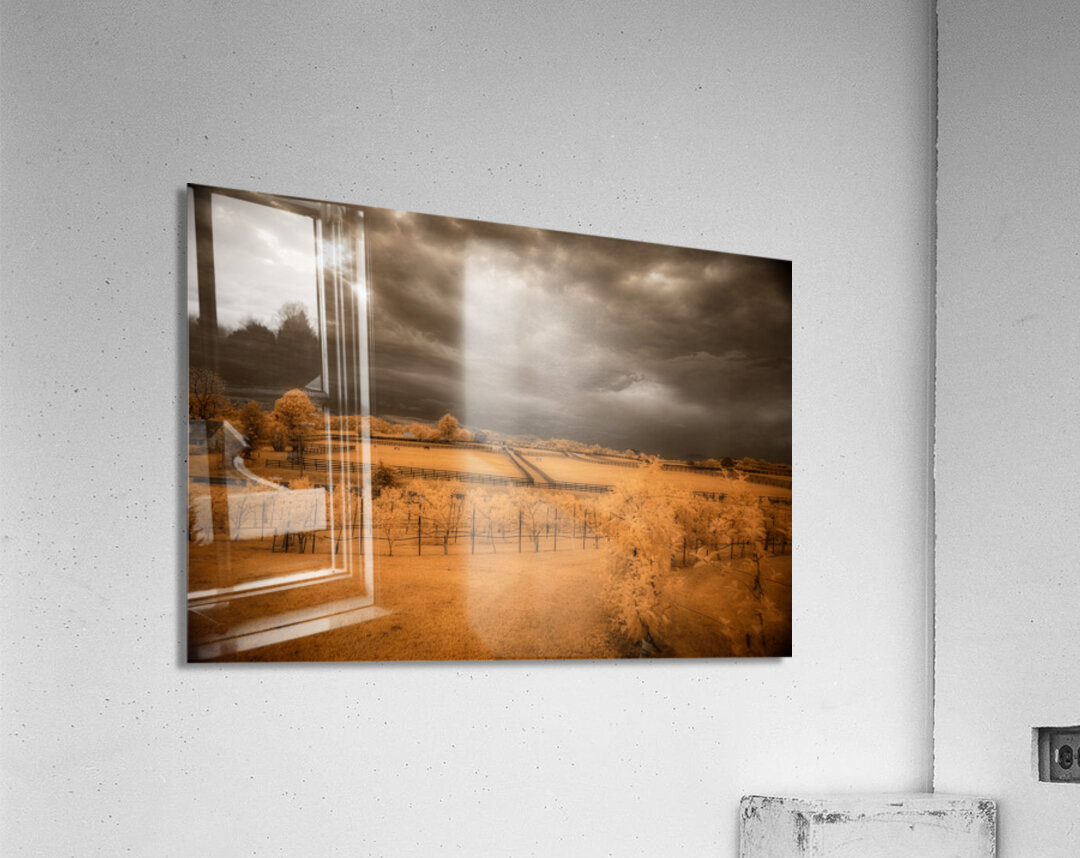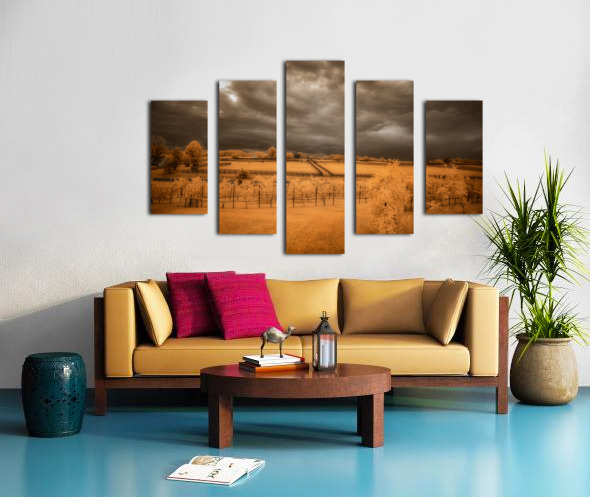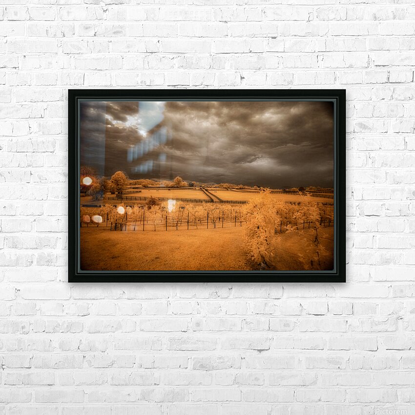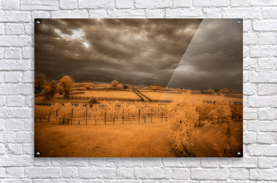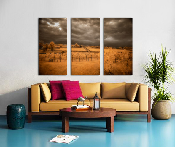 Step into a world where reality blurs with fantasy in Golden Vineyard. A mesmerizing landscape captured through the lens of an infrared technique this piece invites you to explore a realm of ethereal beauty and otherworldly charm. Imposing clouds dance with textured intensity in the sky casting shadows and light across fenced fields that descend in terraces creating a sense of depth and mystery. Whitish-glowing foliage adorns the scattered vegetation lending a surreal quality to the scene while rows of grapevines in a vineyard stand out against a vibrant golden and orange backdrop. The play of light and shadow the stark contrast between the dark sky and the glowing leaves and the overall atmospheric ambiance of the image draw you into a realm where reality and imagination intertwine. Golden Vineyard is a masterpiece that exudes a sense of quiet contemplation and transcendent beauty. It invites you to immerse yourself in its mystical allure and enigmatic charm.