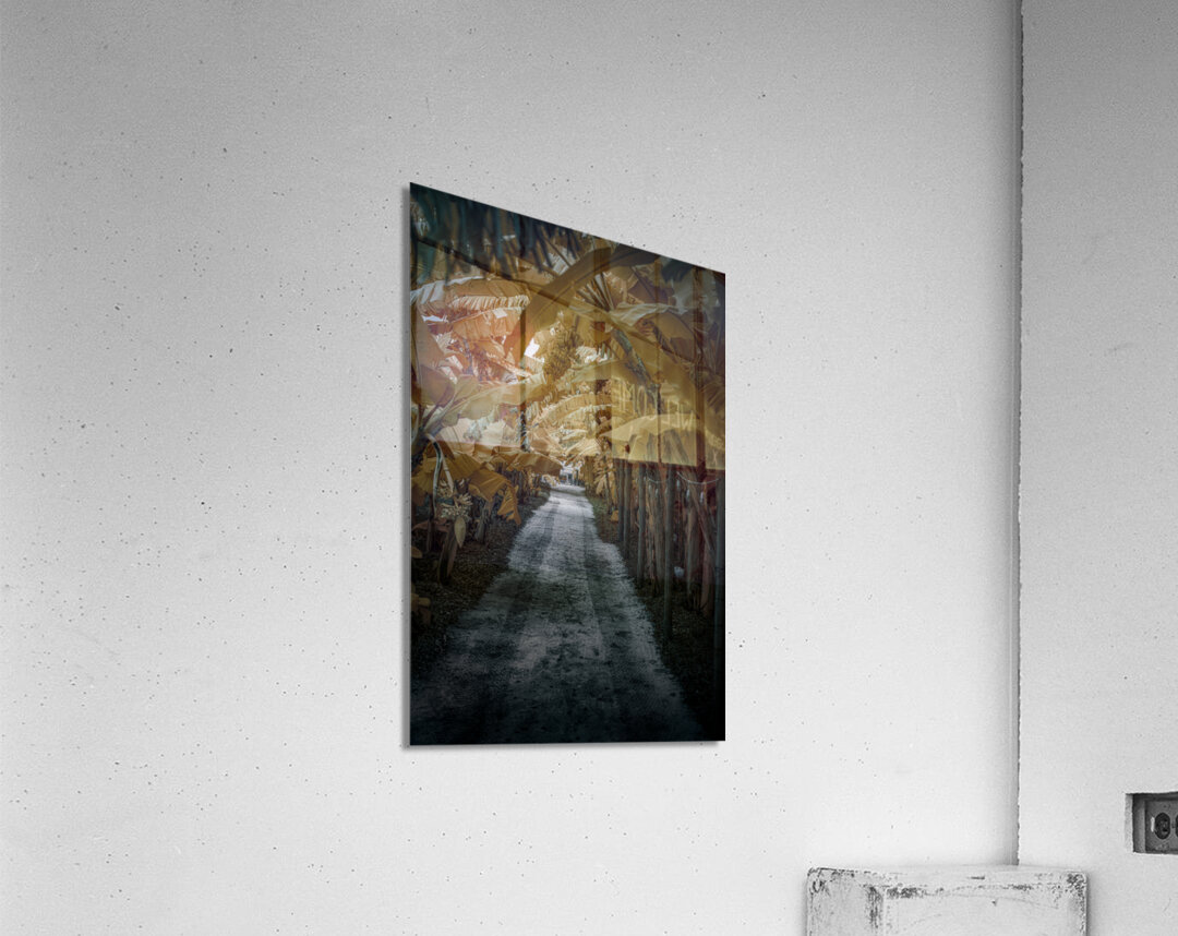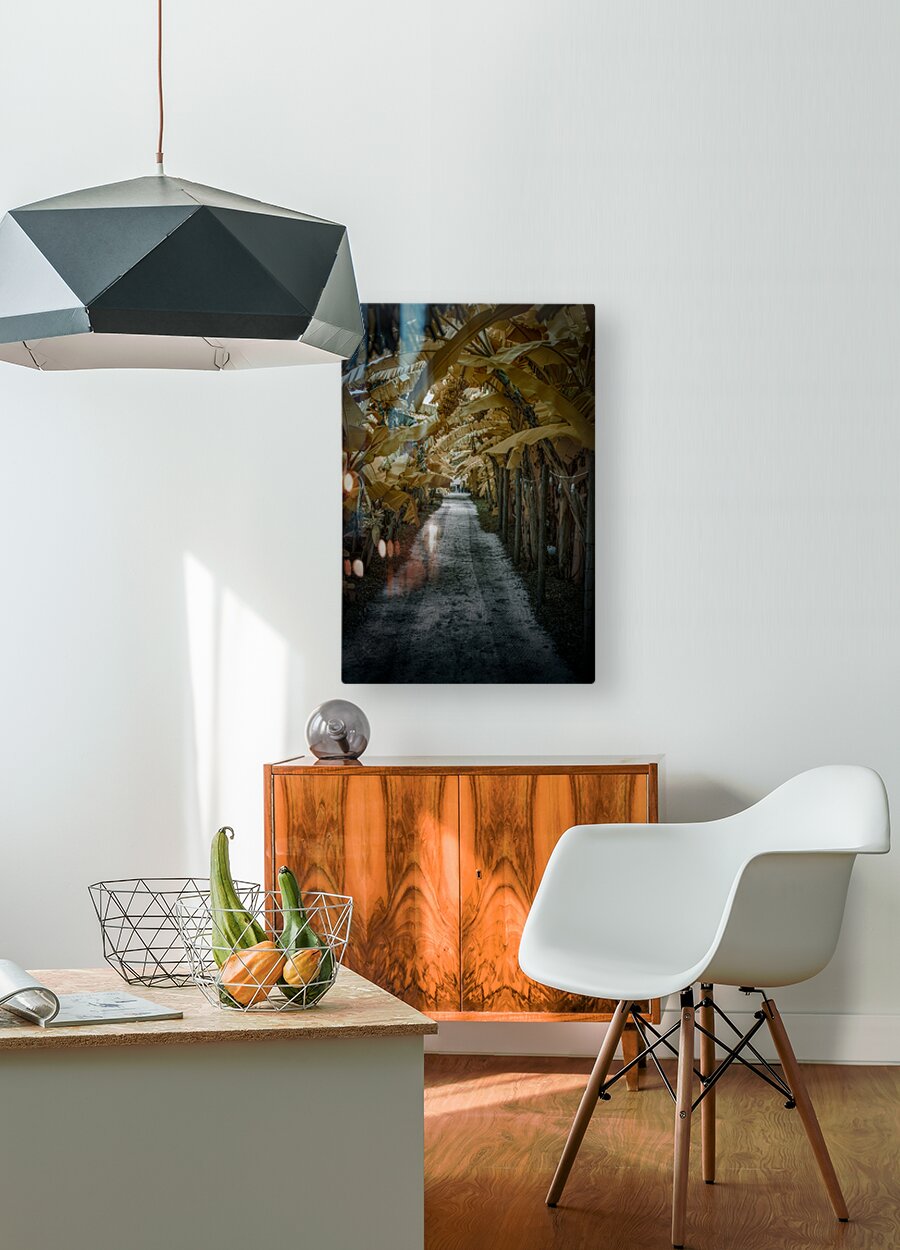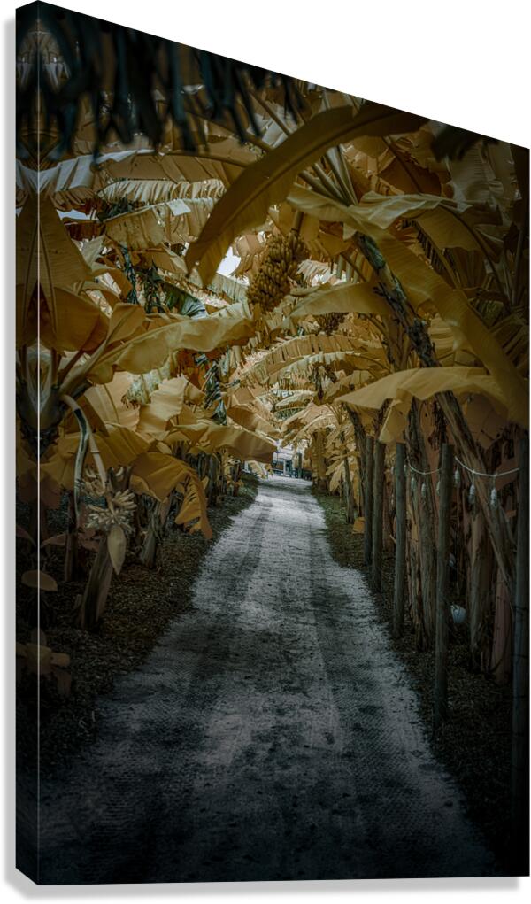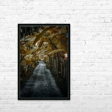 Enter a dreamlike realm where rows of banana trees create a majestic canopy overhead their leaves adorned in otherworldly yellow and teal hues. A winding pathway traverses this surreal landscape disappearing into the distant horizon where reality merges with fantasy. The artists masterful use of color and perspective achieves a mesmerizing effect beckoning the viewer to journey through this mystical realm where the mundane transforms into the extraordinary. Explore the enchanting world of Banana Perspective and uncover the hidden beauty that transcends the ordinary.