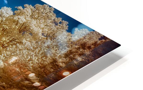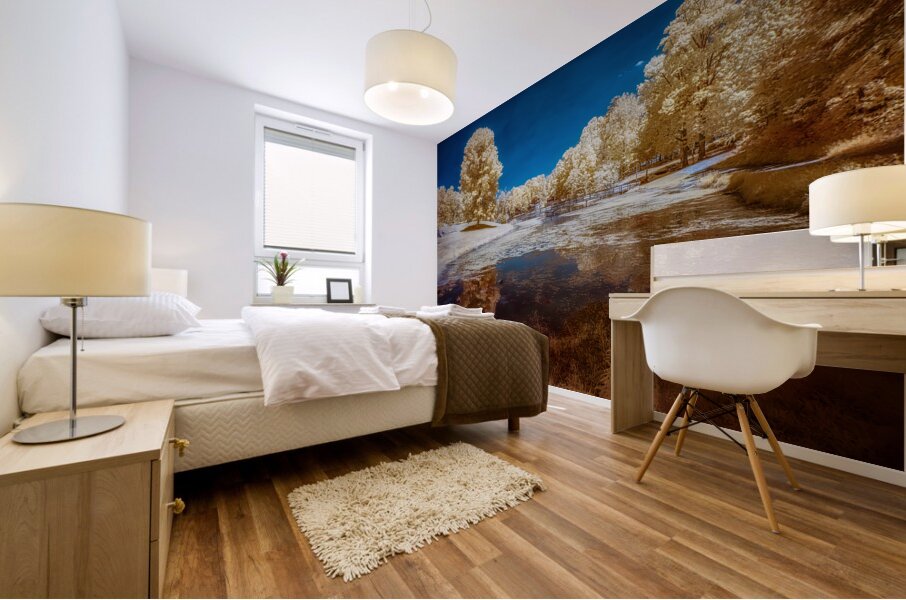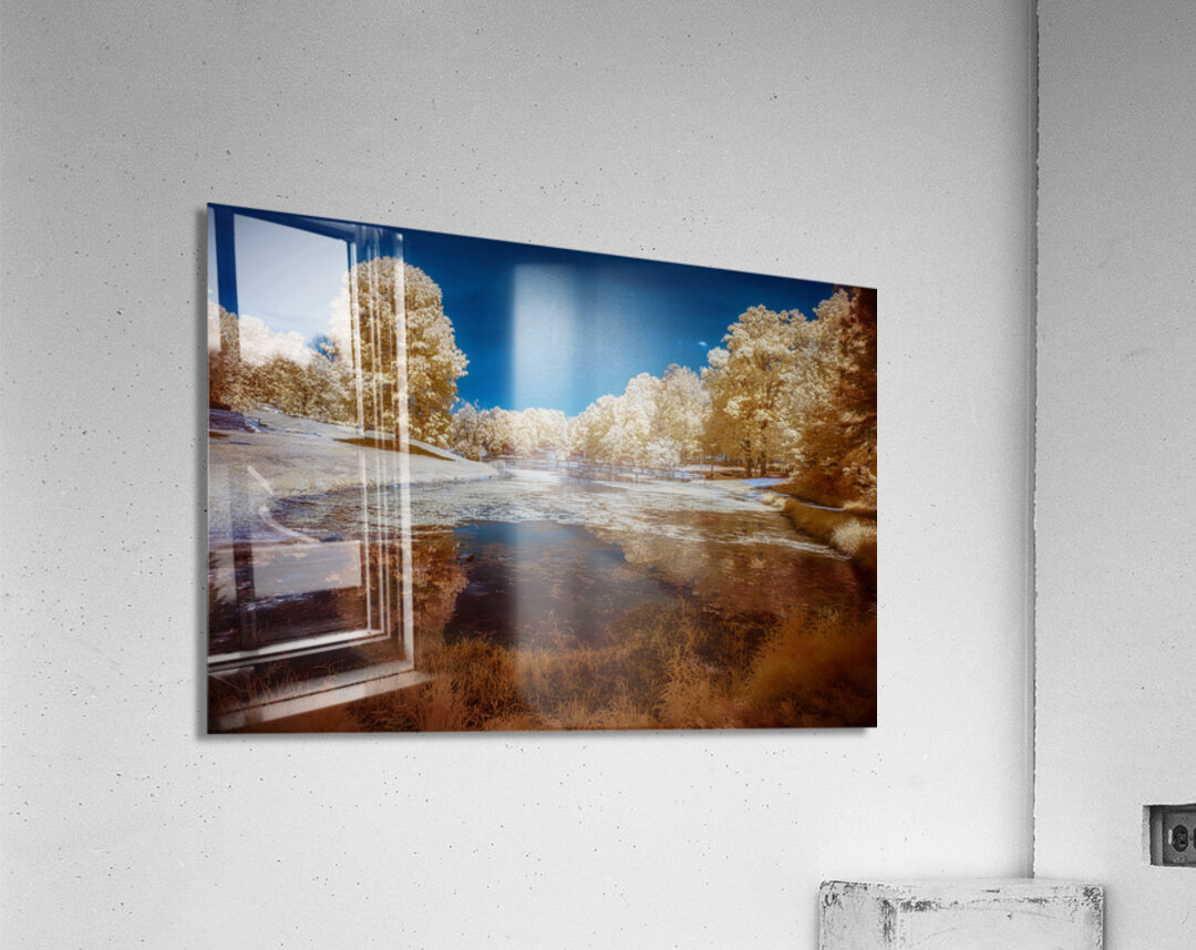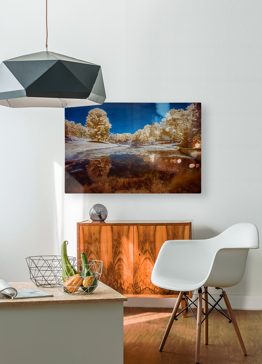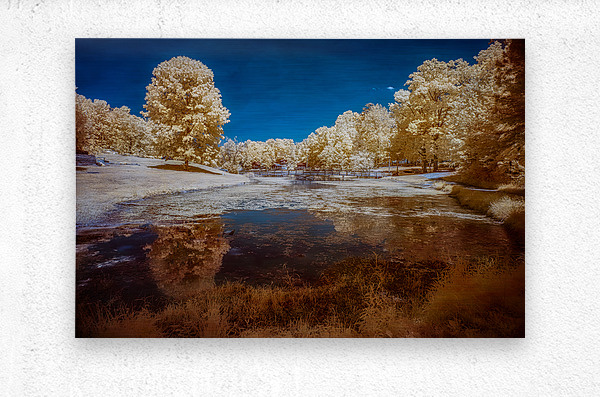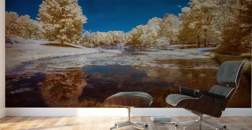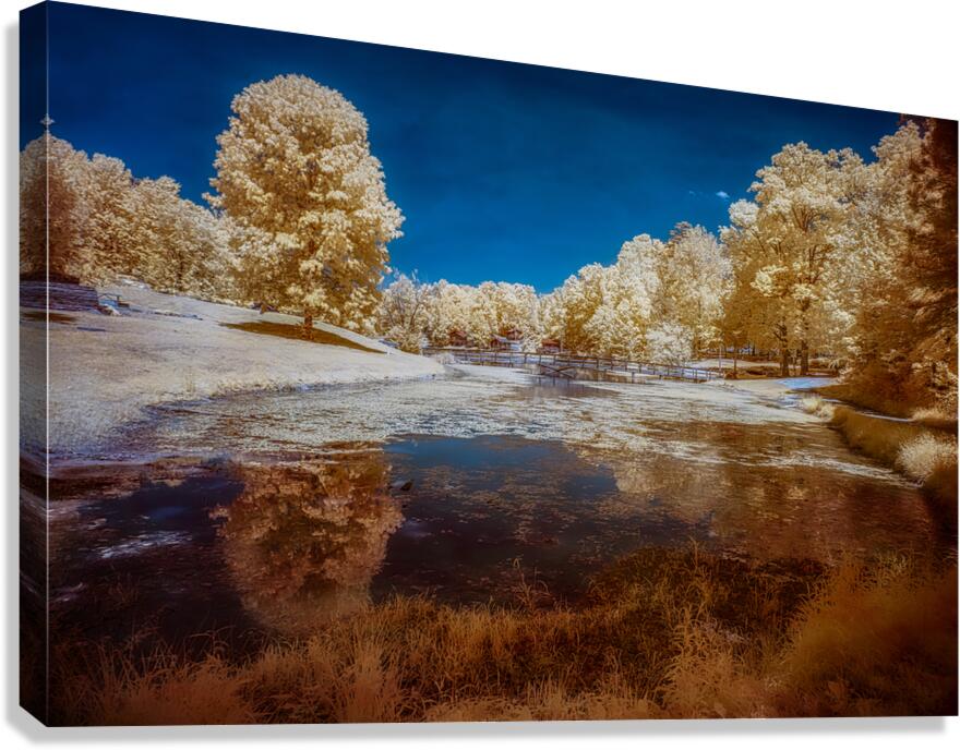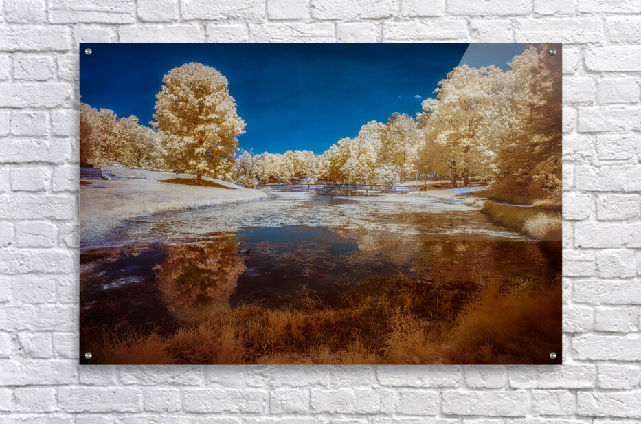 As the morning mist parted like a gossamer curtain, a realm beyond ordinary perception revealed itself. There, at Forest Lake, where reality danced with dreams, stood a humble footbridge – a wooden sentinel connecting our world to something far more magical. The trees, as if touched by Midas himself, didn't wear their usual earthly greens. Instead, they glowed with an ethereal golden-white radiance, their branches reaching toward a sky painted in depths of mysterious blue that no artist's palette could quite capture. Each leaf seemed to pulse with its own inner light, telling secrets only visible through the lens of infrared photography. Below, the lake lay still as glass, performing its age-old ritual of mirror magic. Like a master copyist, it doubled the wonder above, creating a perfect reflection where sky met water in an endless kiss. The result? A perfect symmetry of dreams, where up and down lost their meaning, and reality blurred into fantasy. The footbridge, weathered yet welcoming, offered more than just passage across the water. It stood as an invitation – a gateway between the mundane and the miraculous. Here, at this precise spot, time seemed to hold its breath, creating a pocket of perfect tranquility where worries dissolved like morning dew. Some say that in these moments, when the light plays just so and the water holds its breath, visitors can glimpse a world that exists parallel to our own. A world where trees whisper ancient stories, and the sky holds colors that don't have names in any human language. This isn't just a photograph; it's a portal to possibility, a reminder that magic still exists in the quiet corners of our world. All we need to do is pause, look, and allow ourselves to be transported by the wonder that surrounds us. What stories do you think this mystical scene might be whispering to those who dare to listen?