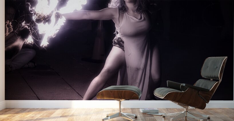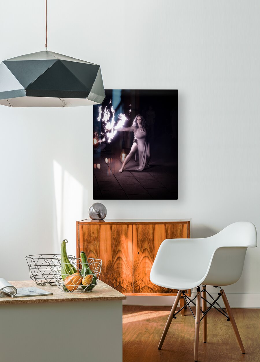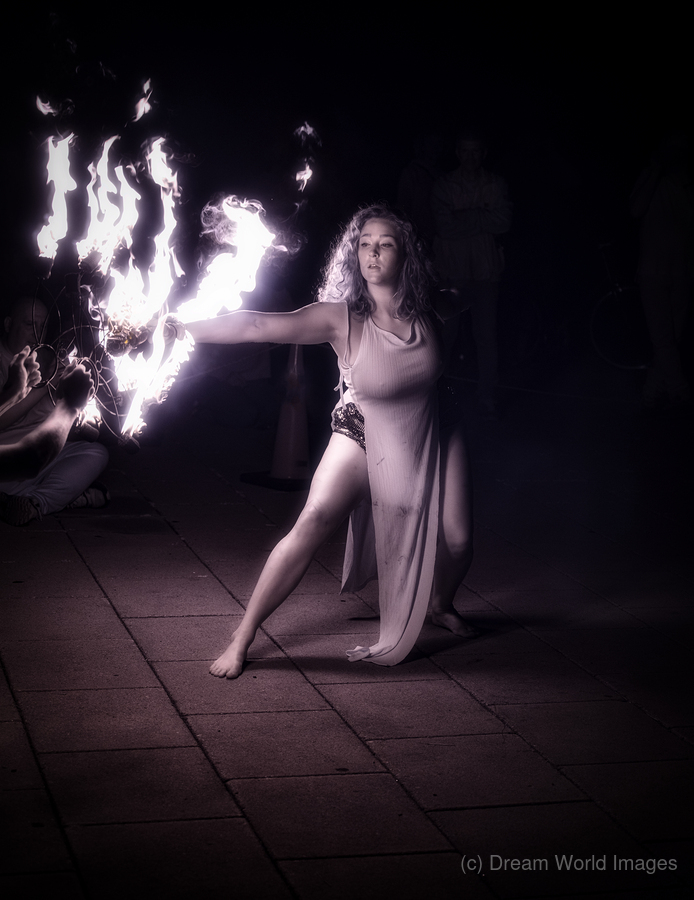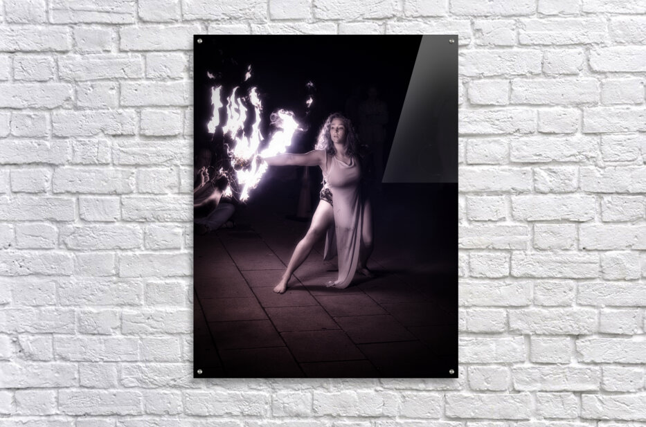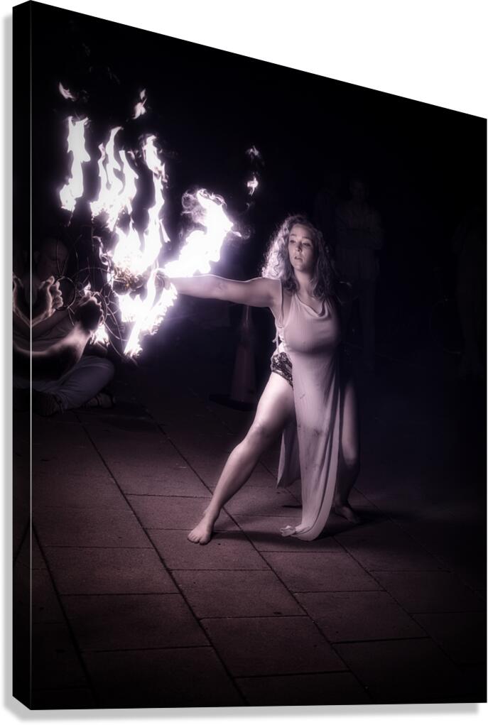 Behold the mesmerizing enchantment of Pyro Poetry an otherworldly photograph that captures the essence of a fiery performance. This striking image immortalizes a woman cloaked in an aura of mystique and strength as she wields a blazing object in her right hand. The incandescent flames illuminate the scene casting dynamic shadows that dance across the urban canvas of a paved surface. Her flowing attire ripples with the motion of her body mirroring the fluidity and grace of her movements. The stark light contrasts created by the fire engender an atmosphere of intensity and profound focus drawing the viewer into a realm where raw power meets eloquent elegance. The interplay of light and dark envelops the scene in a hypnotic glow veiling reality in a silken shroud of magic and allure. In this moment captured through the lens the performer becomes a conduit of primal energy and serene beauty. Pyro Poetry invites the audience to step into a twilight world where the mundane is transformed and every flicker of flame whispers secrets of the beyond.