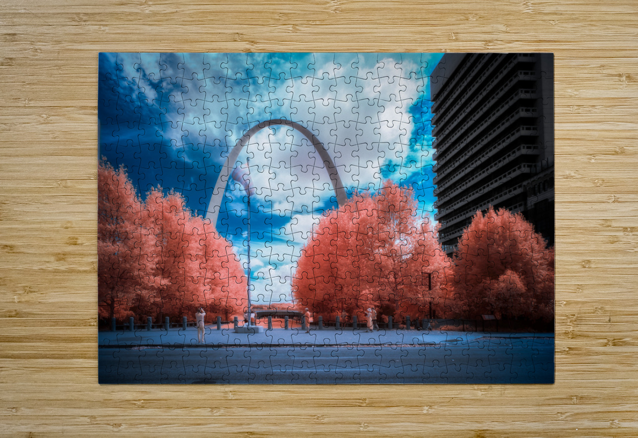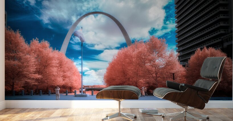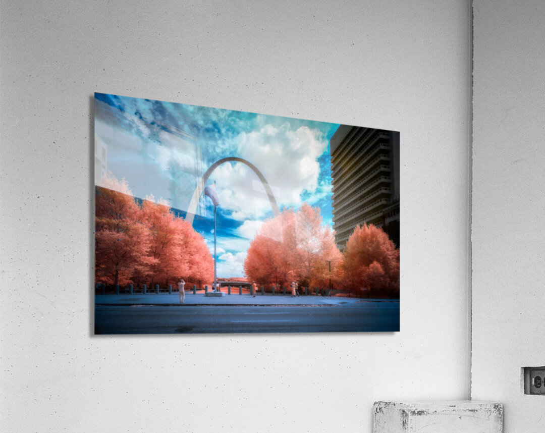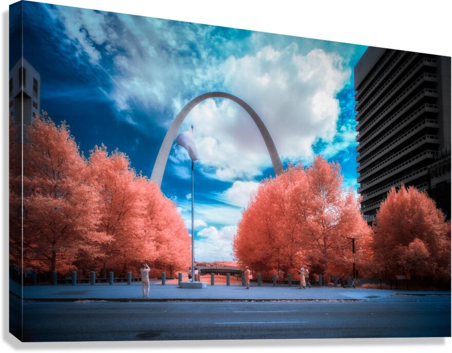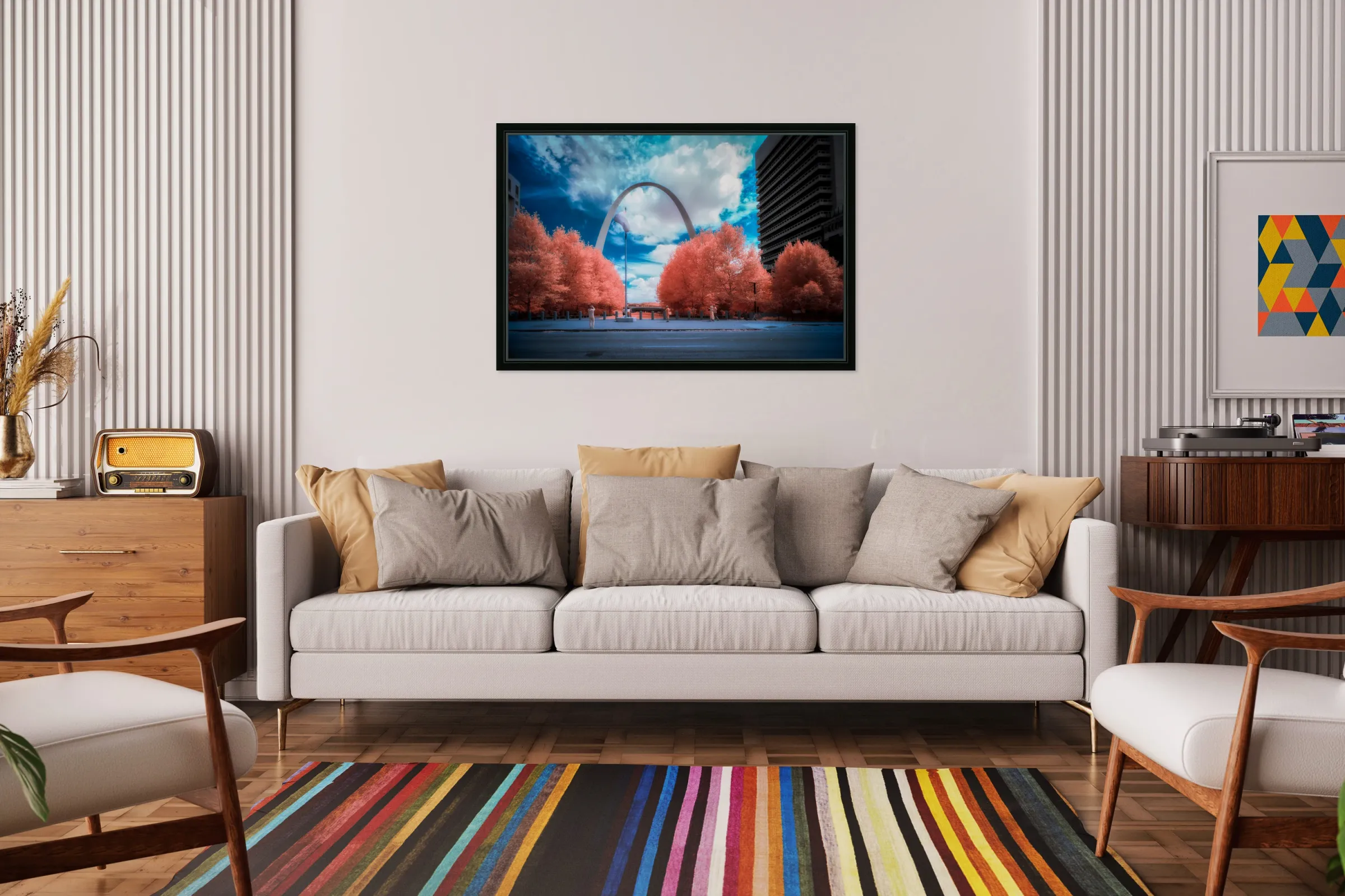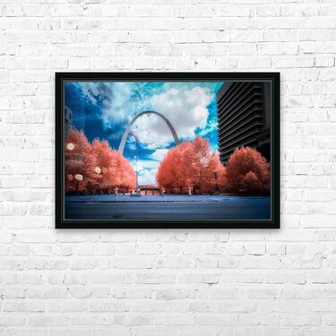 Archway to Surreal Horizons is an arresting piece that transcends the boundaries of reality inviting the viewer to step into a realm where the commonplace morphs into the otherworldly. This mesmerizing infrared photograph captures a grand arch standing as a sentinel amidst a dreamscape where natures colors defy conventional hues. Framed by trees adorned with intensely vivid red and orange foliage the arch seems to pulsate with an almost mystical energy juxtaposed against an expansive sky of cobalt blue strewn with wisps of white clouds. In this surreal tableau the spectral rays of infrared light imbue the surroundings with an ethereal quality transforming the trees into veritable sentinels of a fantastical world. The arch positioned majestically at the center reaches skyward serving not just as a physical structure but as a portal to unseen dimensions. Below this celestial gateway people amble photograph and gaze in awe their presence lending scale and humanity to the surreal setting. Their mundane actions root the scene in our reality even as the hyperreal colors and atmosphere suggest a transcendence into the extraordinary. The artwork’s dreamlike quality evokes a sense of wonder and contemplation presenting a familiar urban landscape through a lens of enchanting distortion. The viewer is guided through an enigmatic journey where every element—natural or man-made—conspires to blur the lines between the known and the imagined the real and the fantastical.