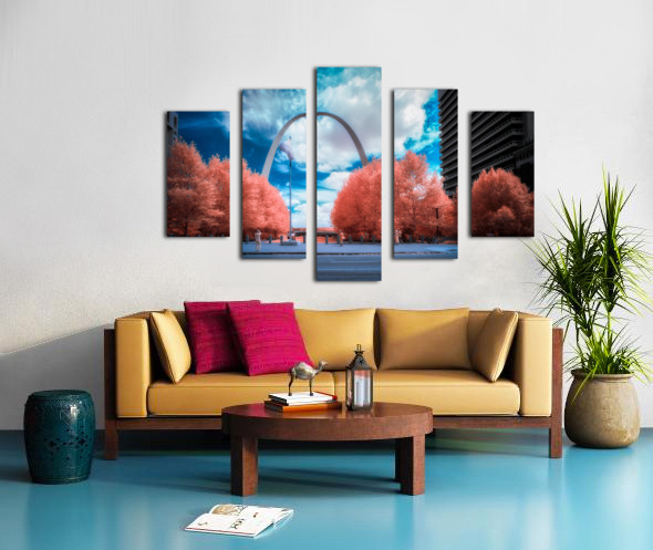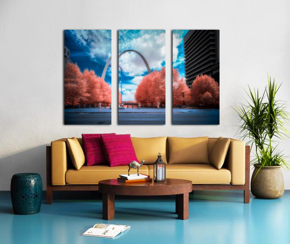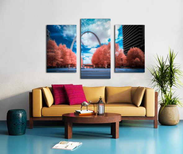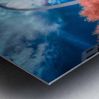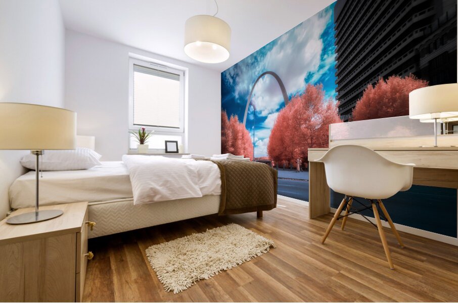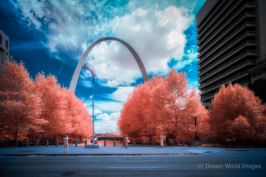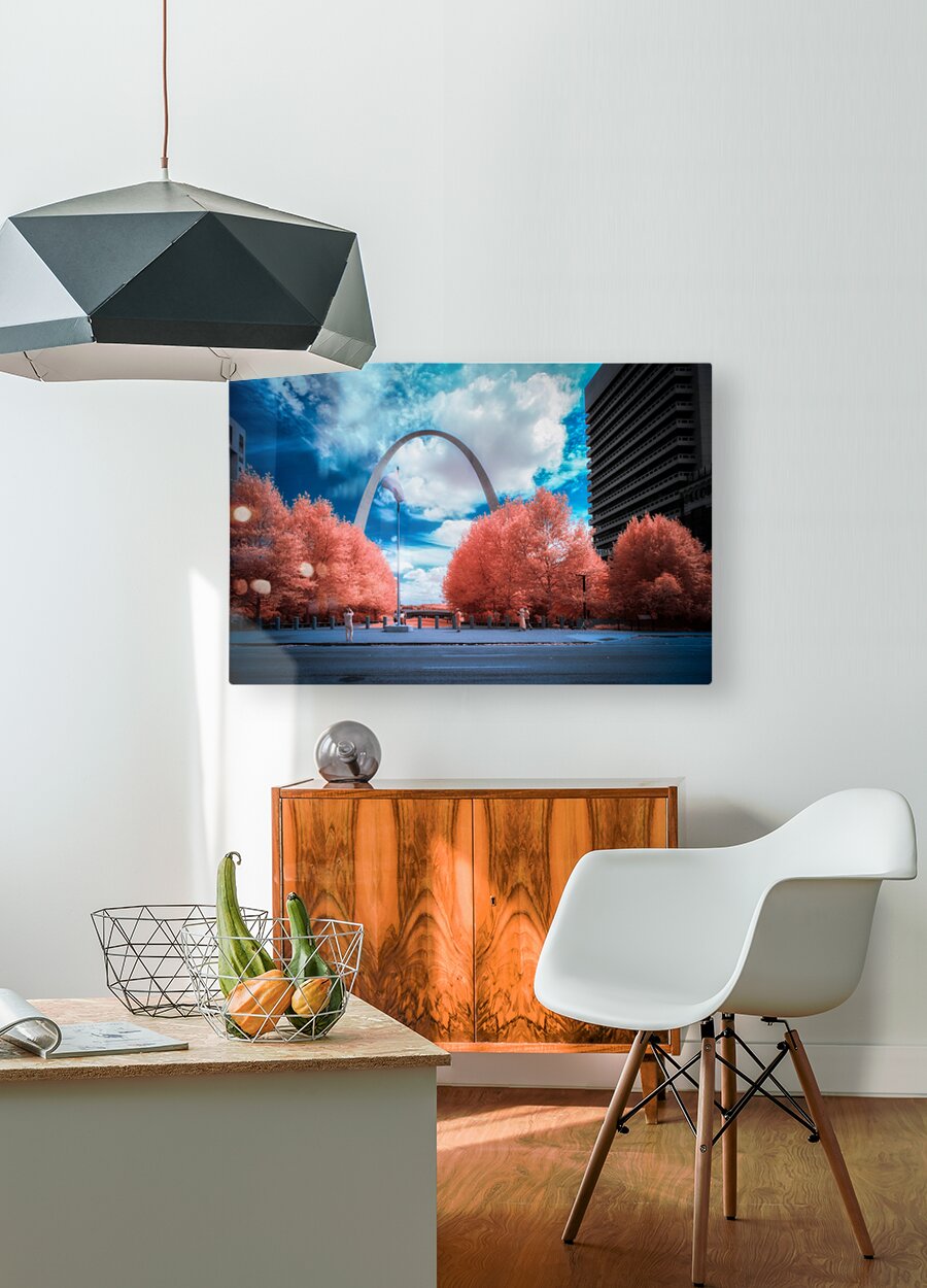 Archway to Surreal Horizons is an arresting piece that transcends the boundaries of reality inviting the viewer to step into a realm where the commonplace morphs into the otherworldly. This mesmerizing infrared photograph captures a grand arch standing as a sentinel amidst a dreamscape where natures colors defy conventional hues. Framed by trees adorned with intensely vivid red and orange foliage the arch seems to pulsate with an almost mystical energy juxtaposed against an expansive sky of cobalt blue strewn with wisps of white clouds. In this surreal tableau the spectral rays of infrared light imbue the surroundings with an ethereal quality transforming the trees into veritable sentinels of a fantastical world. The arch positioned majestically at the center reaches skyward serving not just as a physical structure but as a portal to unseen dimensions. Below this celestial gateway people amble photograph and gaze in awe their presence lending scale and humanity to the surreal setting. Their mundane actions root the scene in our reality even as the hyperreal colors and atmosphere suggest a transcendence into the extraordinary. The artwork’s dreamlike quality evokes a sense of wonder and contemplation presenting a familiar urban landscape through a lens of enchanting distortion. The viewer is guided through an enigmatic journey where every element—natural or man-made—conspires to blur the lines between the known and the imagined the real and the fantastical.