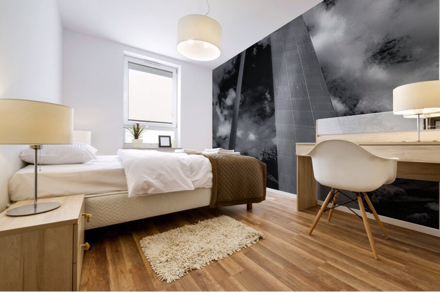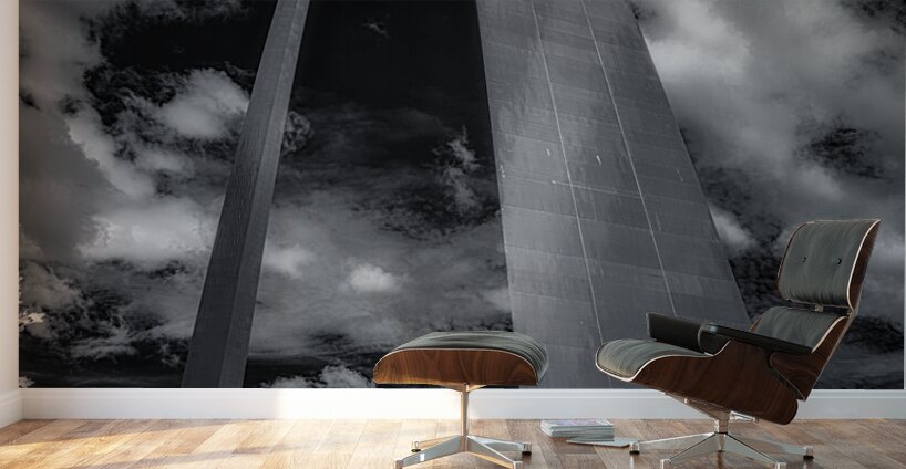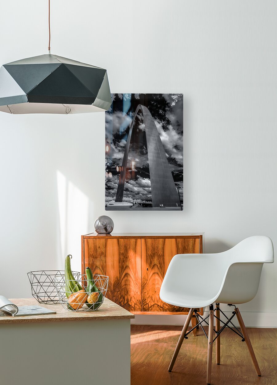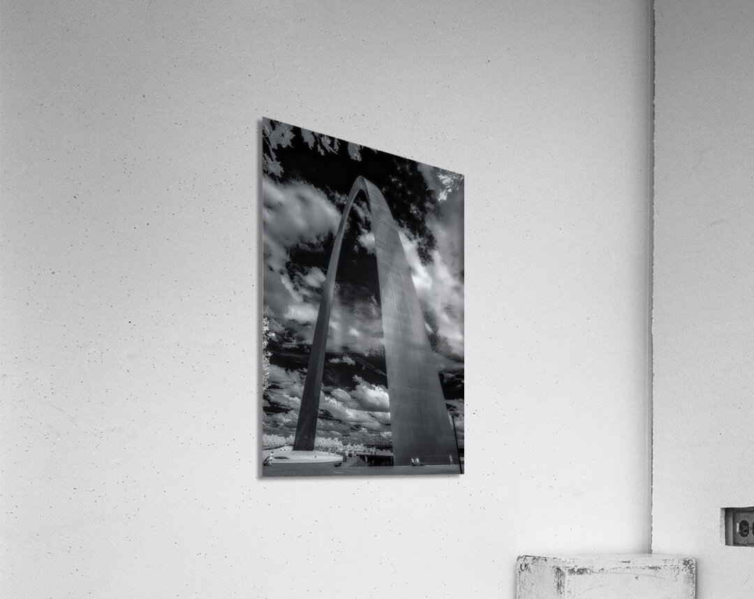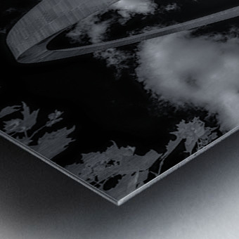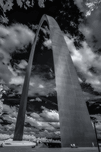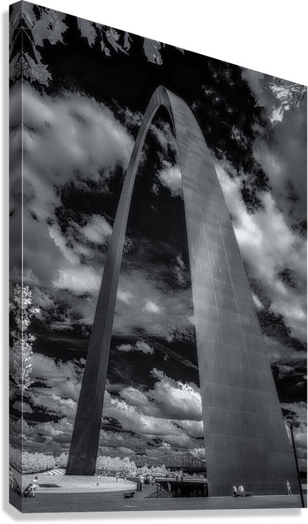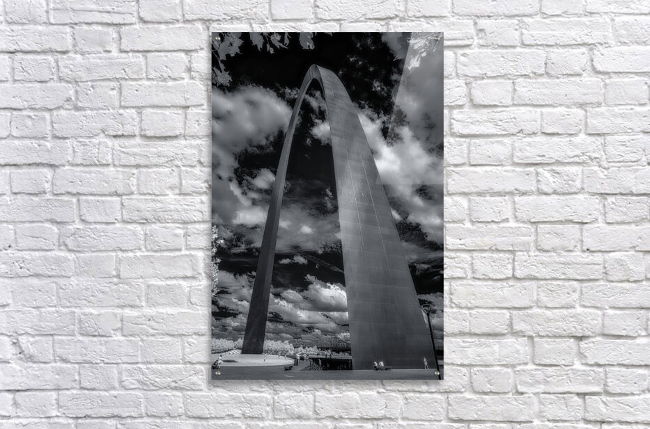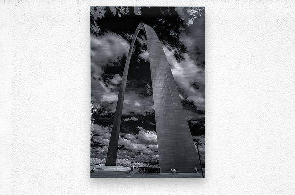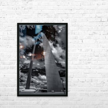The image captures the awe-inspiring beauty of an iconic arch that reaches majestically into the heavens. This striking infrared photograph is a masterpiece that combines elements of architecture and natural splendor. Rendered in black and white the image reveals a play of shadows and highlights bringing the smooth sleek lines of the arch into sharp focus. The dramatic clouds that spread across the sky add a textured backdrop enhancing the sense of scale and grandeur of the imposing structure. In this powerful composition every line and curve of the arch is imbued with a sense of purpose and elegance. The photograph not only freezes a moment in time but also evokes a feeling of limitless potential and upward aspiration. The juxtaposition of light and shadow creates depth making the monument appear even more formidable and impressive. This artwork serves as a testament to human achievement and the boundless possibilities of reaching ever higher.