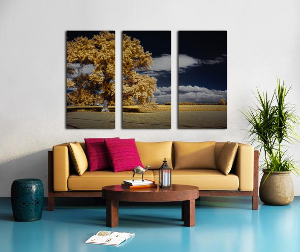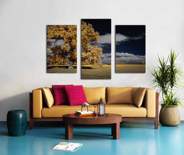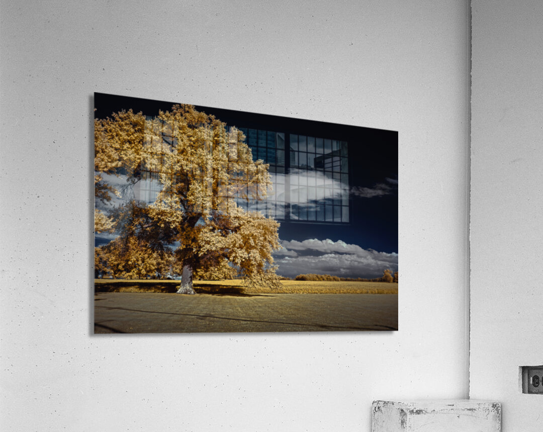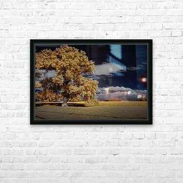 A striking vision in spectral hues this infrared masterpiece presents a large tree with a dense canopy of yellowish-orange foliage that seems almost o...[+]