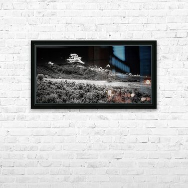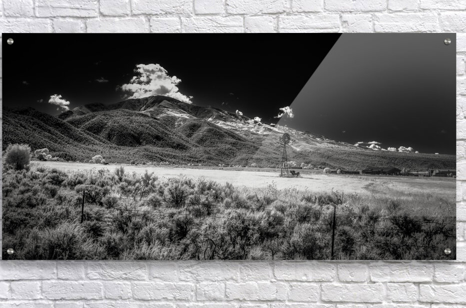 Isolated Windmill Beneath Rugged Peaks is a black-and-white photograph that plunges the viewer into the embrace of an enigmatic and boundless landscap...[+]
