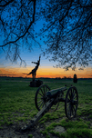 As dawns first light breaks over Gettysburgs hallowed grounds the Louisiana monument emerges from the shadows bathed in the soft glow of the morning sun. Positioned prominently against the backdrop of a vibrant sunrise the statue stands as a solemn tribute to the soldiers who fought bravely on this historic battlefield. At the heart of the monument a wounded gunner of the New Orleans Washington Artillery stands in silent vigil his gaze fixed on the horizon. With one hand clasping a Confederate battle flag to his chest he embodies the spirit of sacrifice and valor that defined the Confederacys soldiers. Above him the Spirit of the Confederacy stands tall sounding a trumpet and raising a flaming cannonball symbolizing the enduring legacy of their cause. In the distance a cannon stands sentinel its barrel pointing skyward as if standing guard over the monument and the memory it represents. The cannons presence adds a sense of protection and fortitude to the scene reinforcing the resilience of those who fought and died on these hallowed grounds. As the sun continues its ascent casting a warm and golden light over the landscape the monuments details come alive. The intricate silhouette of the figures evokes a sense of movement and emotion capturing the raw intensity of battle and the unyielding determination of the soldiers. Crafted by the skilled hands of artist Donald DeLue renowned for his monument sculptures Spirit Triumphant: Louisiana Protection is more than just a work of art—it is a testament to the strength courage and resilience of those who fought and sacrificed on the fields of Gettysburg.