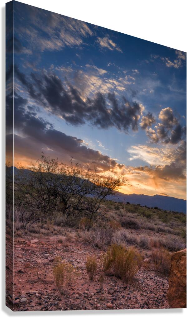 Radiance Unfurled Over Rocky Plains beckons the viewer into a realm where earth meets sky in an ethereal embrace. My wife and I were driving back from the store in Cottonwood Arizona when the sky started to light up in the most spectacular way. We couldn’t resist so we pulled over onto a dirt road to capture this image. This captivating photograph unveils a desert landscape cloaked in the mystique of twilight. In the foreground rugged dry shrubs and the rocky terrain stand as silent sentinels guardians of an ancient and untamed wilderness. A solitary tree resolute against the encroaching dusk reaches skyward framed by the distant shadowy grandeur of mountains that whisper secrets of time immemorial. Above the heavens unfold in a mesmerizing dance of light and shadow. Dramatic clouds gather at the horizon woven with threads of golden and fiery orange as the sun surrenders its radiance to the encroaching night. Piercing through this celestial tapestry luminous rays of sunlight stream defiantly through the cloud cover casting a divine glow that pierces the deepening blue canopy. This interplay creates a powerful contrast evoking a sense of wonder and the infinite. The piece captures the transient moment when day bows to night encapsulating the profound beauty and mystery of natures fleeting spectacles. Its an invitation to wander into the wild heart of the world and to lose oneself in the enigmatic beauty of the unseen. Radiance Unfurled Over Rocky Plains stands as a testament to the awe-inspiring duality of earth and heavens encouraging the beholder to find their own place within this eternal saga.